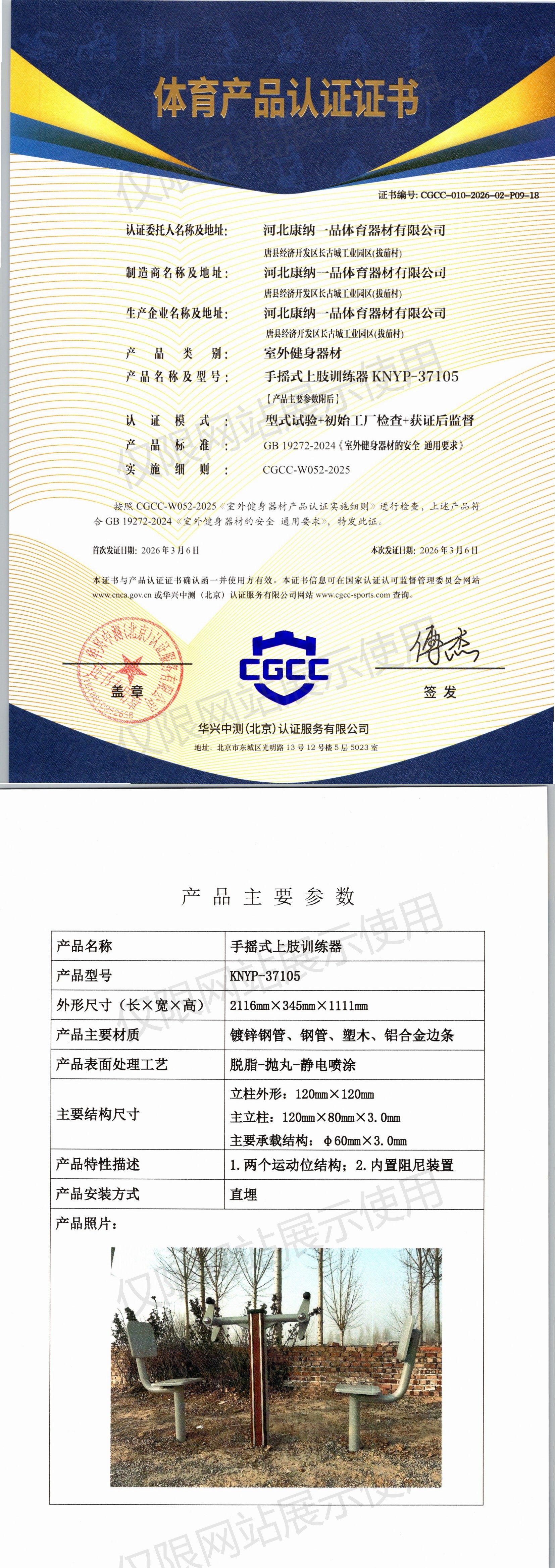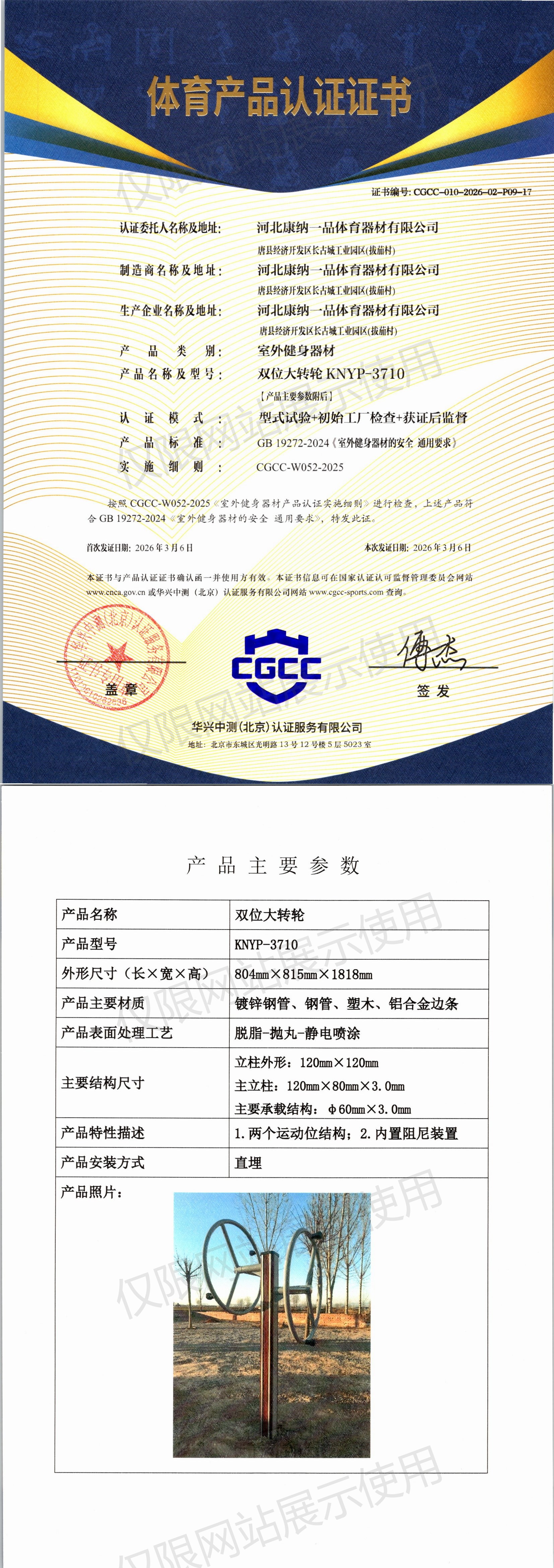 | 5 | 河北康纳一品体育器材有限公司 | CGCC-010-2026-02-P09-17 | 双位大转轮 | KNYP-3710 | 唐县经济开发区长古城工业园区(拔茄村) | GB 19272-2024 | 2026-03-06 | 有效 | 查看 |