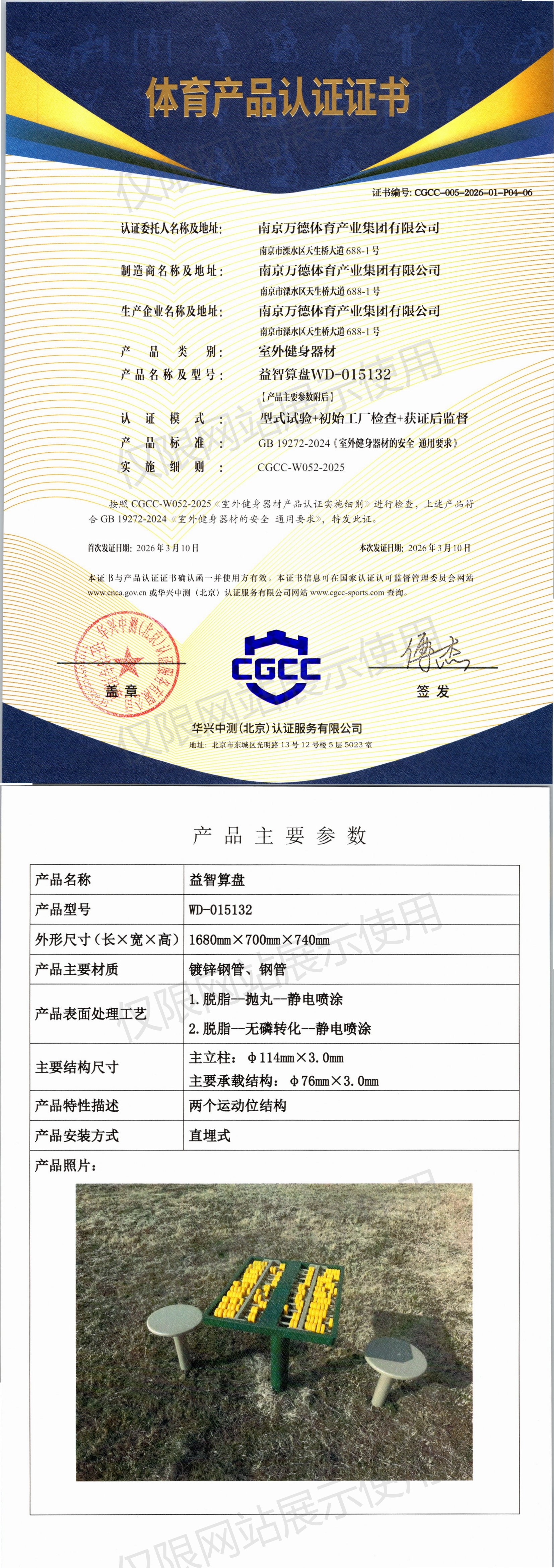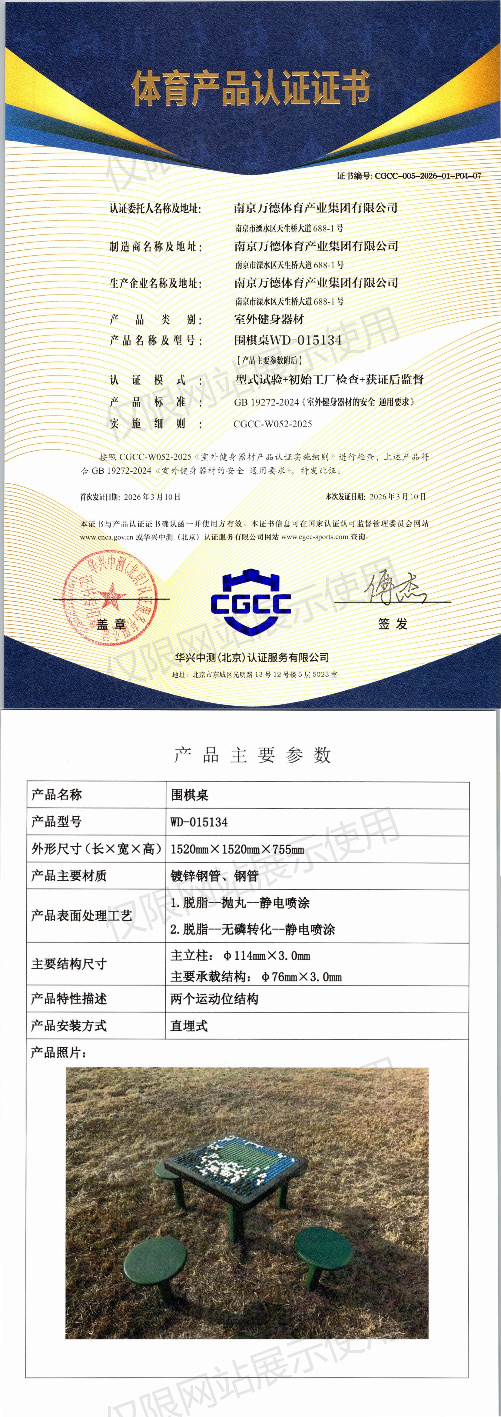 | 8 | 南京万德体育产业集团有限公司 | CGCC-005-2026-01-P04-07 | 围棋桌 | WD-015134 | 南京市溧水区天生桥大道688-1号 | GB 19272-2024 | 2026-03-10 | 有效 | 查看 |