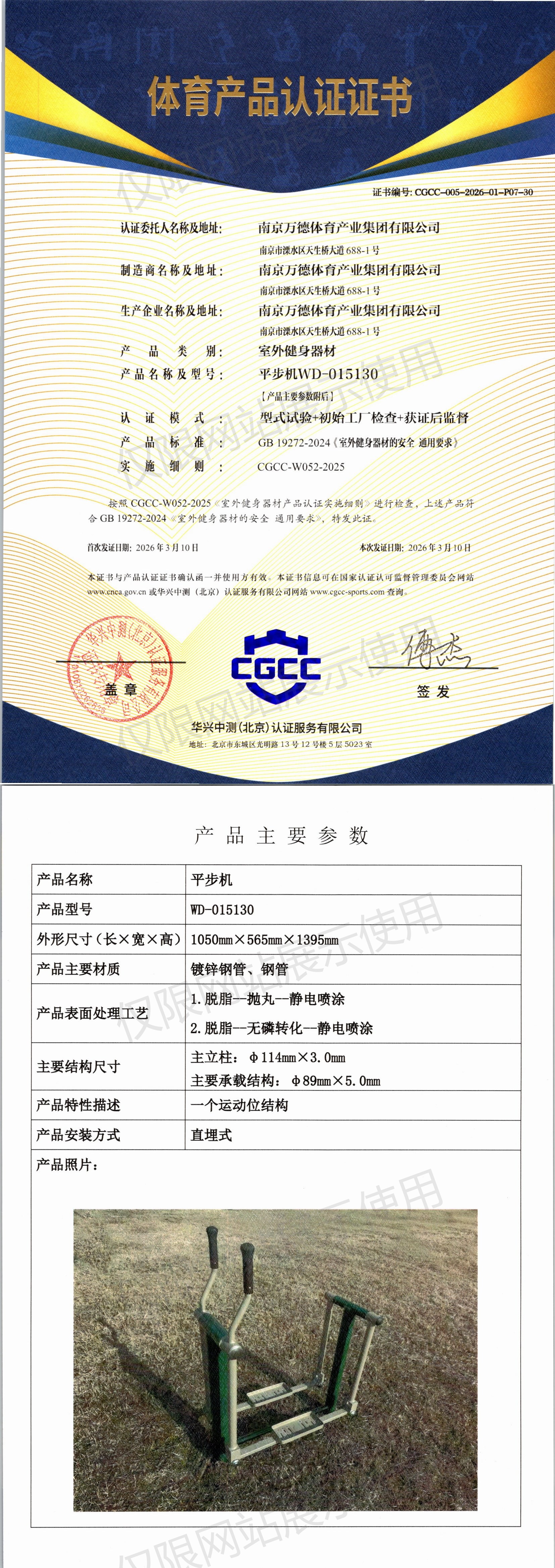 | 9 | 南京万德体育产业集团有限公司 | CGCC-005-2026-01-P07-30 | 平步机 | WD-015130 | 南京市溧水区天生桥大道688-1号 | GB 19272-2024 | 2026-03-10 | 有效 | 查看 |