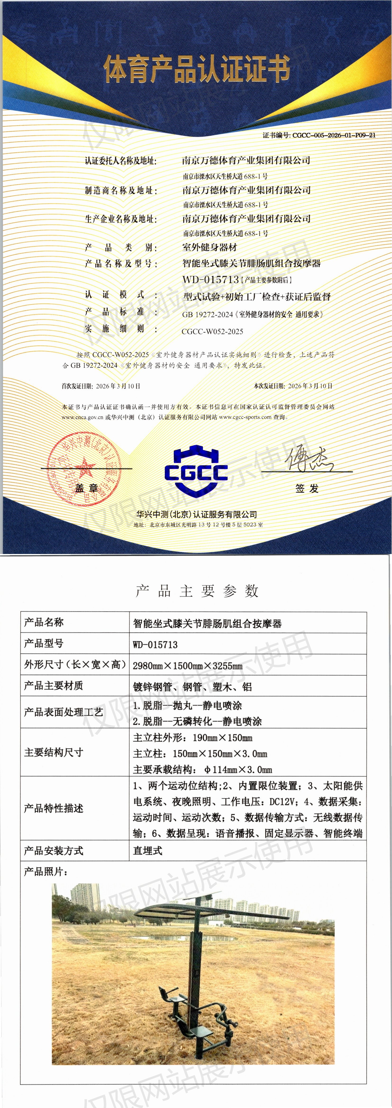 | 10 | 南京万德体育产业集团有限公司 | CGCC-005-2026-01-P09-21 | 智能坐式膝关节腓肠肌组合按摩器 | WD-015713 | 南京市溧水区天生桥大道688-1号 | GB 19272-2024 | 2026-03-10 | 有效 | 查看 |