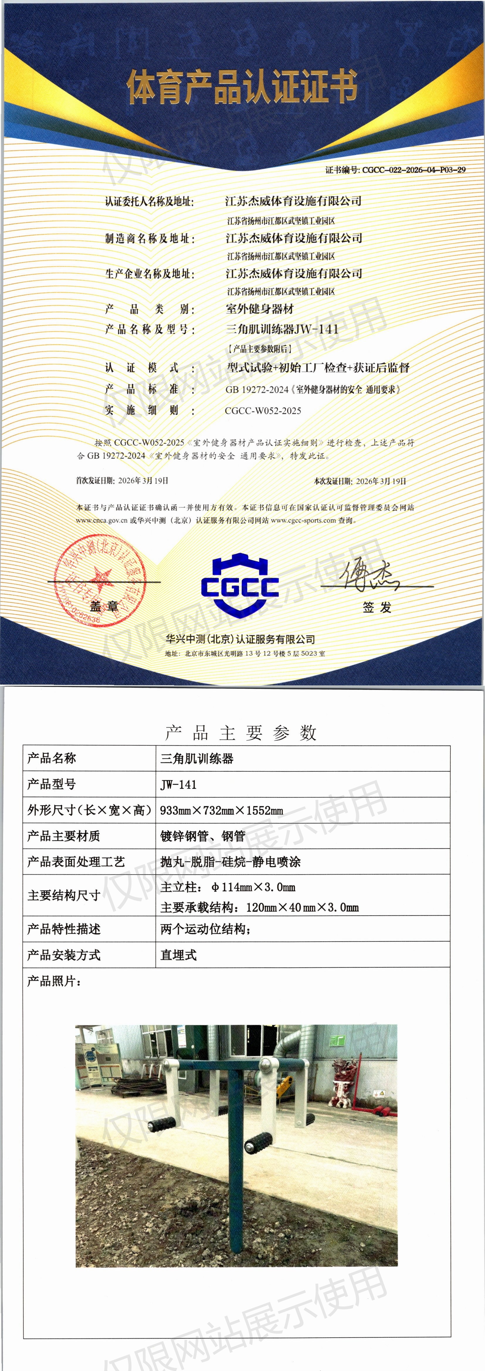 | 2 | 江苏杰威体育设施有限公司 | CGCC-022-2026-04-P03-29 | 三角肌训练器 | JW-141 | 江苏省扬州市江都区武坚镇工业园区 | GB 19272-2024 | 2026-03-19 | 有效 | 查看 |