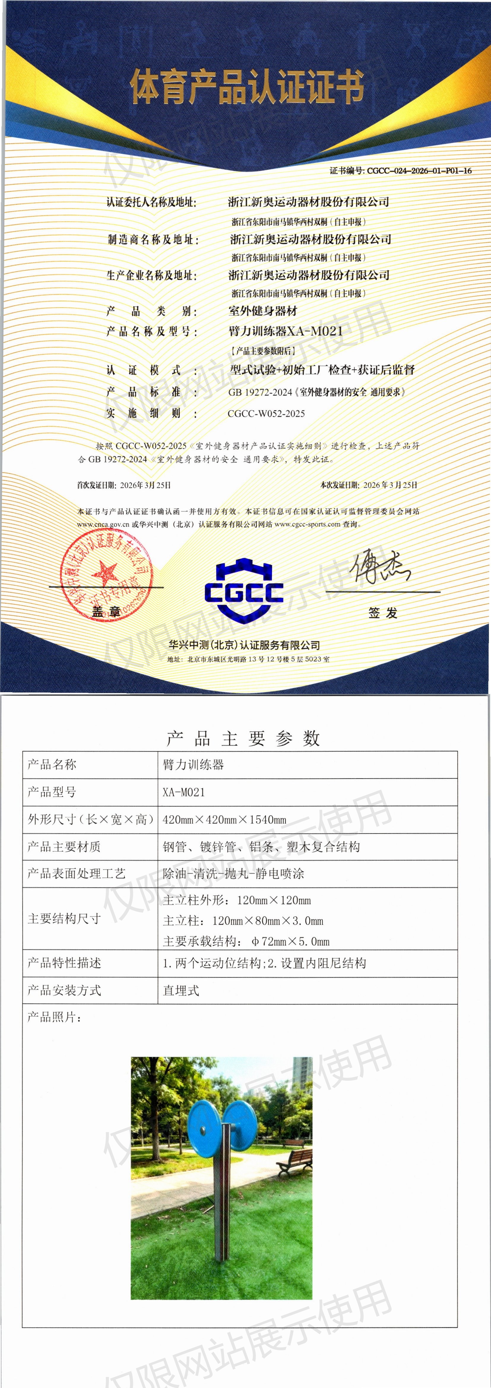 | 3 | 浙江新奥运动器材股份有限公司 | CGCC-024-2026-01-P01-16 | 臂力训练器 | XA-M021 | 浙江省东阳市南马镇华西村双桐(自主申报) | GB 19272-2024 | 2026-03-25 | 有效 | 查看 |