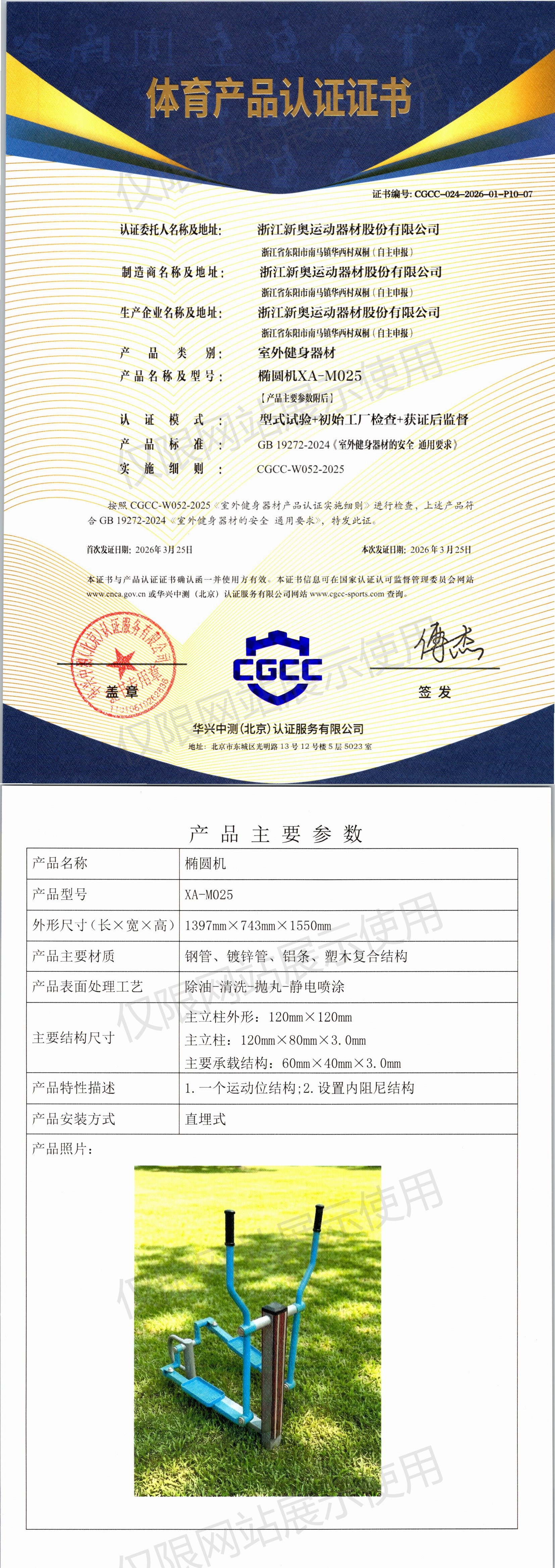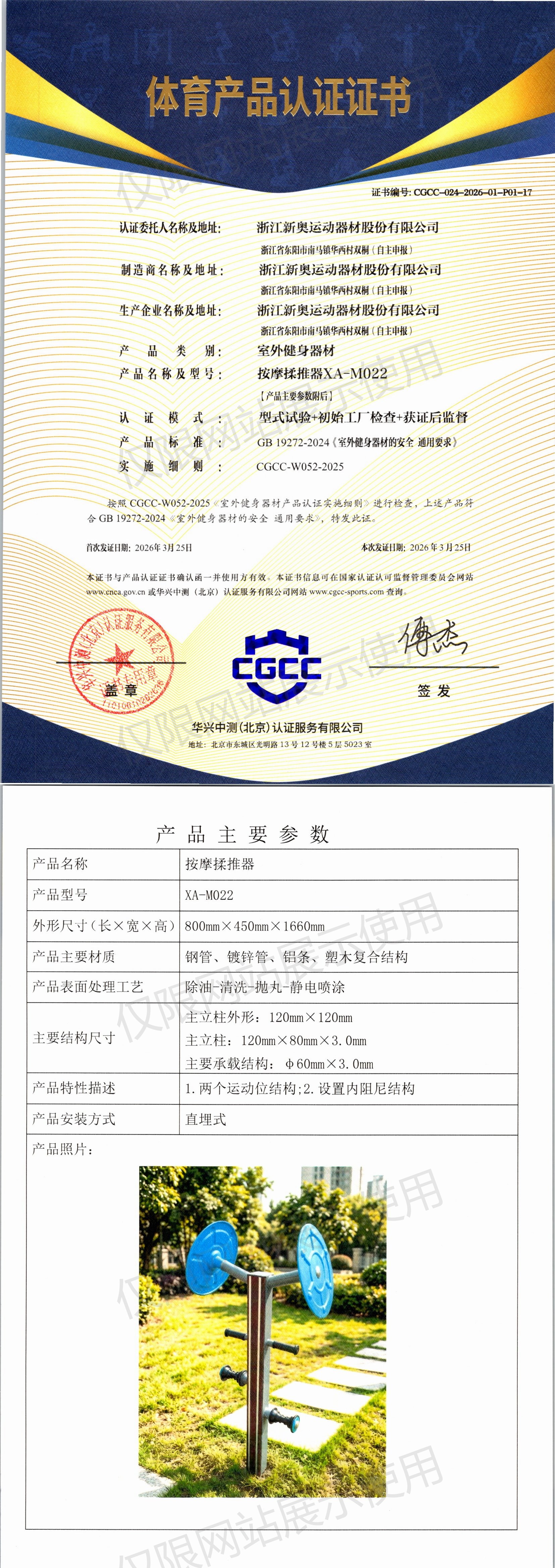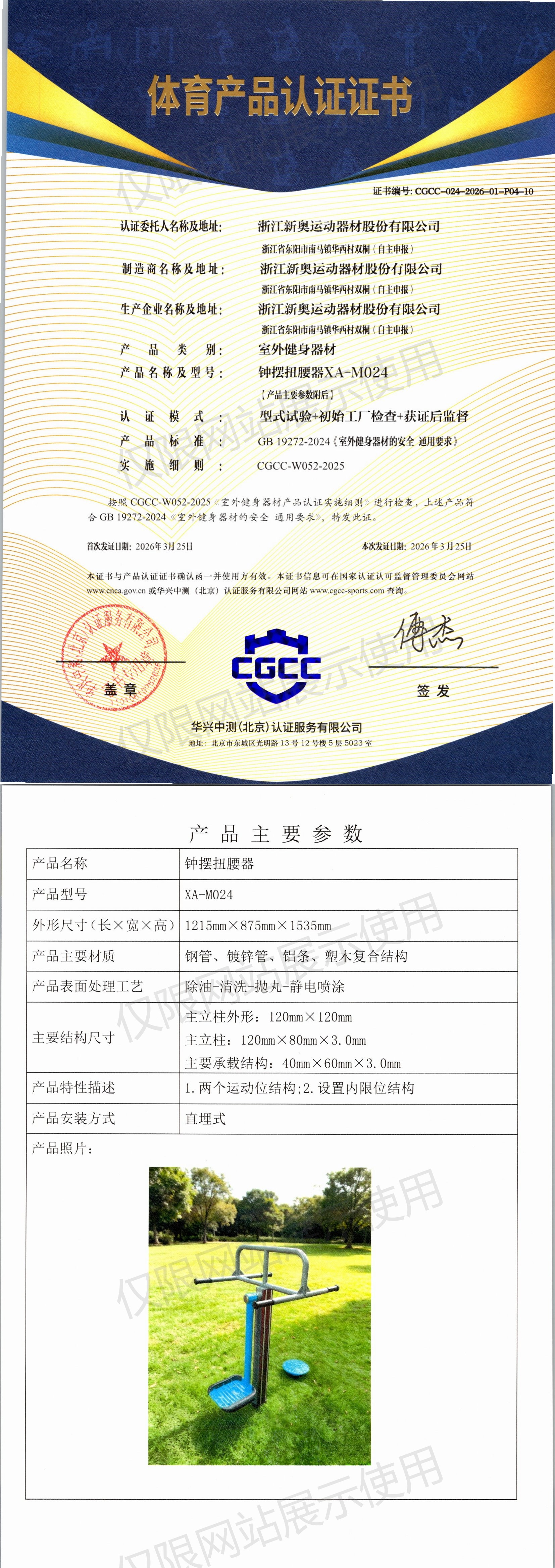 | 8 | 浙江新奥运动器材股份有限公司 | CGCC-024-2026-01-P04-10 | 钟摆扭腰器 | XA-M024 | 浙江省东阳市南马镇华西村双桐(自主申报) | GB 19272-2024 | 2026-03-25 | 有效 | 查看 |