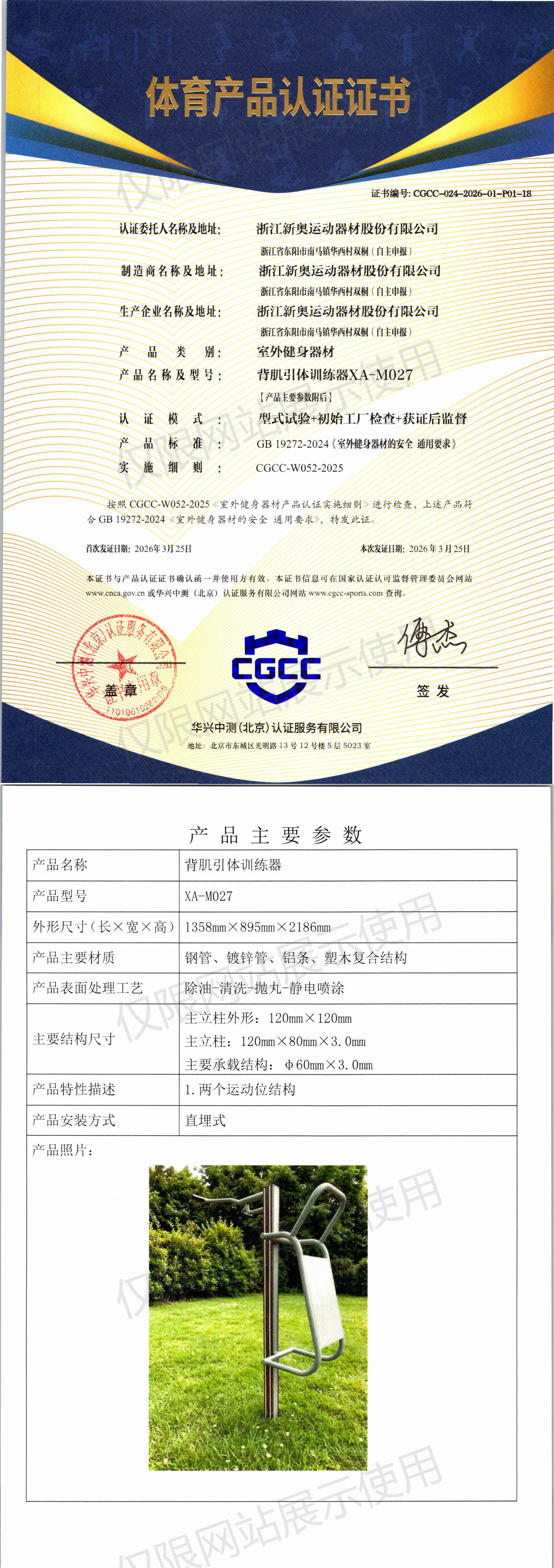 | 5 | 浙江新奥运动器材股份有限公司 | CGCC-024-2026-01-P01-18 | 背肌引体训练器 | XA-M027 | 浙江省东阳市南马镇华西村双桐(自主申报) | GB 19272-2024 | 2026-03-25 | 有效 | 查看 |