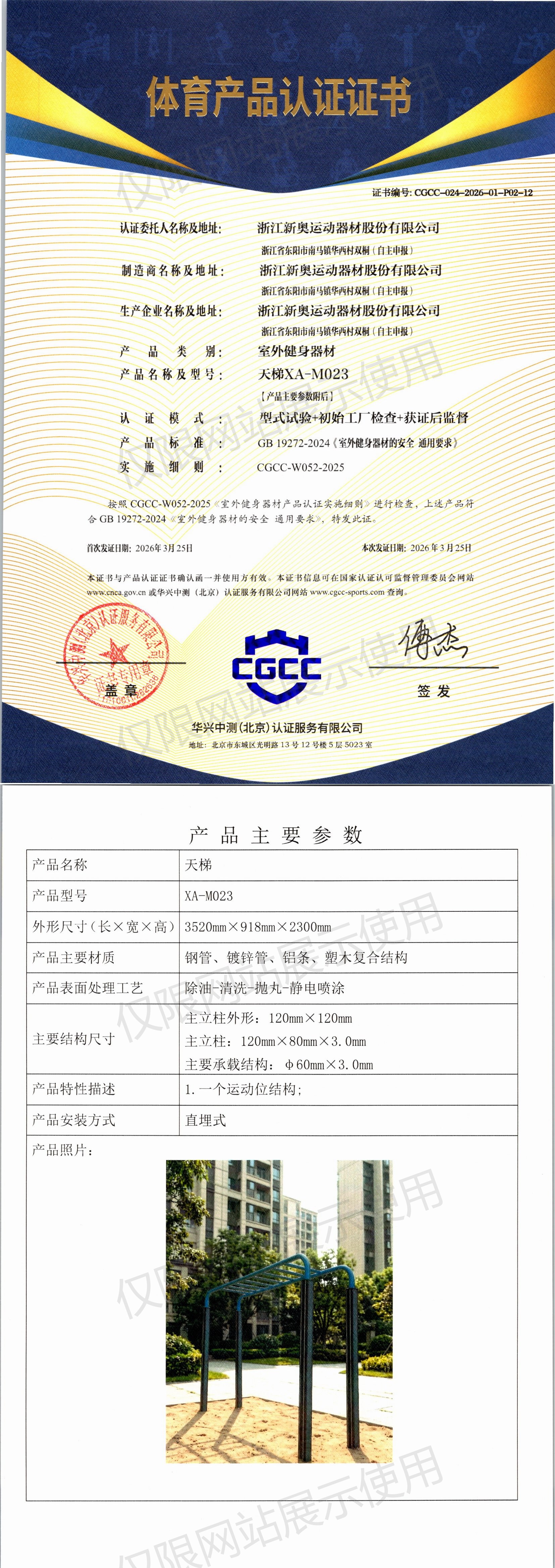 | 6 | 浙江新奥运动器材股份有限公司 | CGCC-024-2026-01-P02-12 | 天梯 | XA-M023 | 浙江省东阳市南马镇华西村双桐(自主申报) | GB 19272-2024 | 2026-03-25 | 有效 | 查看 |