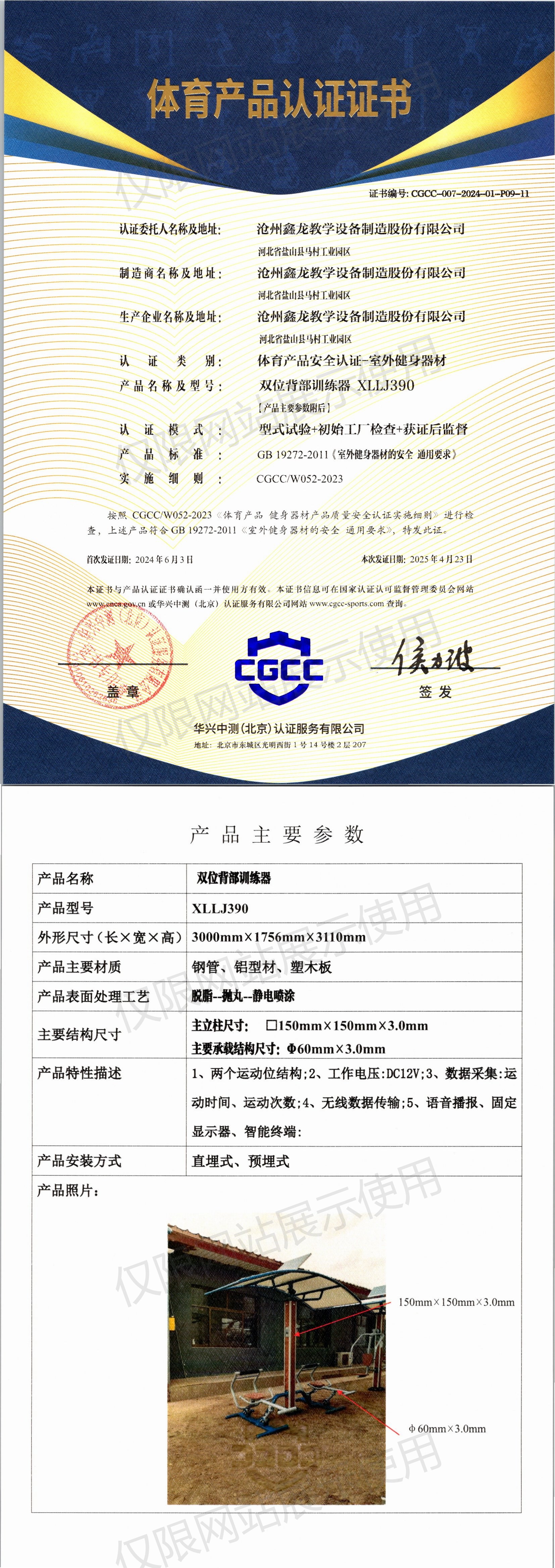 | 8 | 沧州鑫龙教学设备制造股份有限公司 | CGCC-007-2024-01-P01-03 | 三位扭腰器 | XLLJ044W | 河北省沧州市盐山县经济开发区正港工业园区正港路021号 | GB 19272-2024 | 2024-06-13 | 有效 | 查看 |