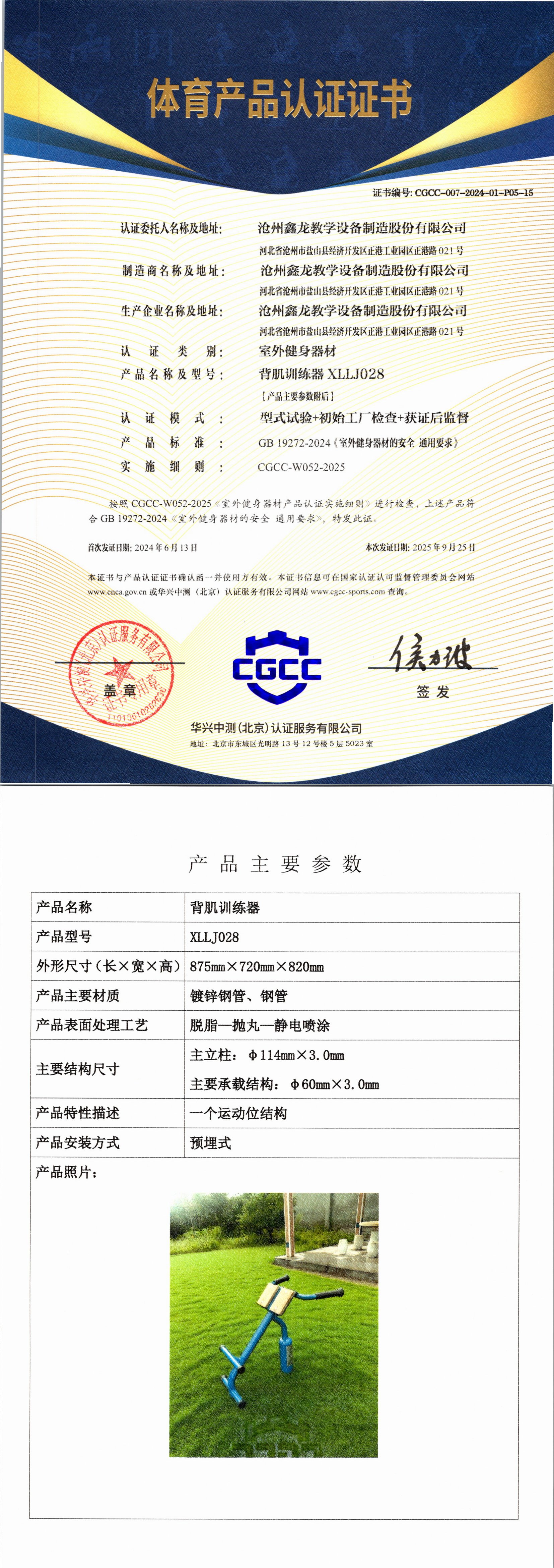 | 2 | 沧州鑫龙教学设备制造股份有限公司 | CGCC-007-2024-01-P05-15 | 背肌训练器 | XLLJ028 | 河北省沧州市盐山县经济开发区正港工业园区正港路 021号 | GB 19272-2024 | 2024-06-13 | 有效 | 查看 |