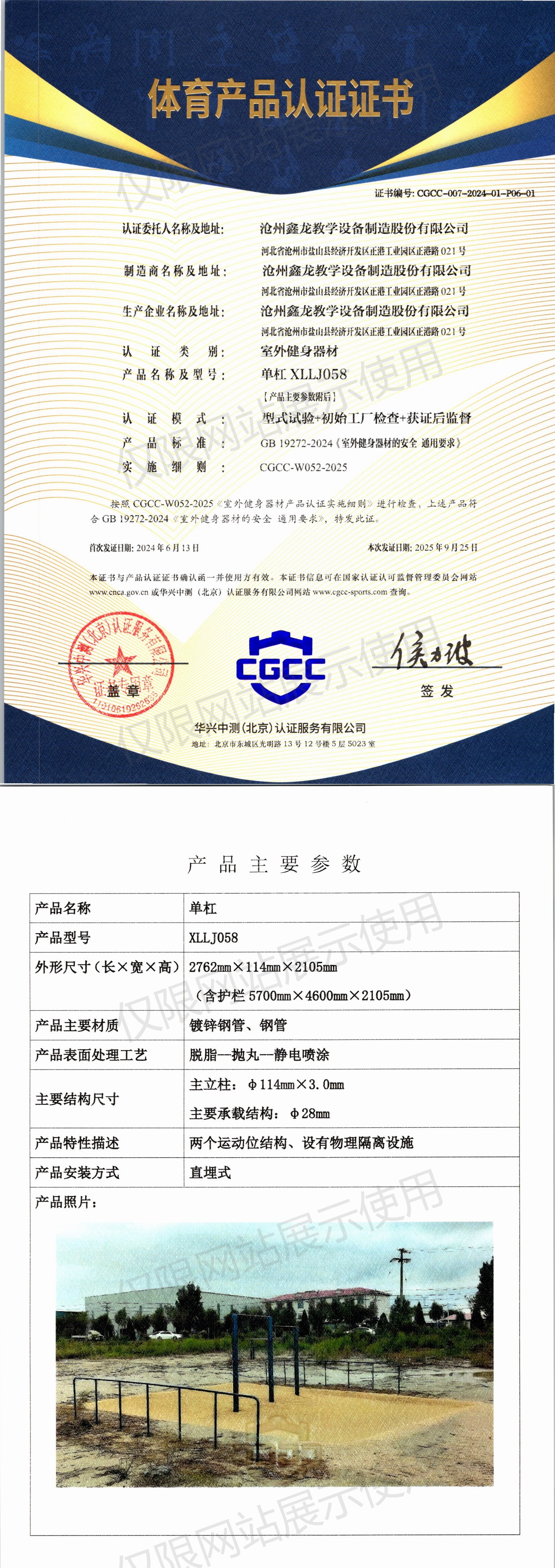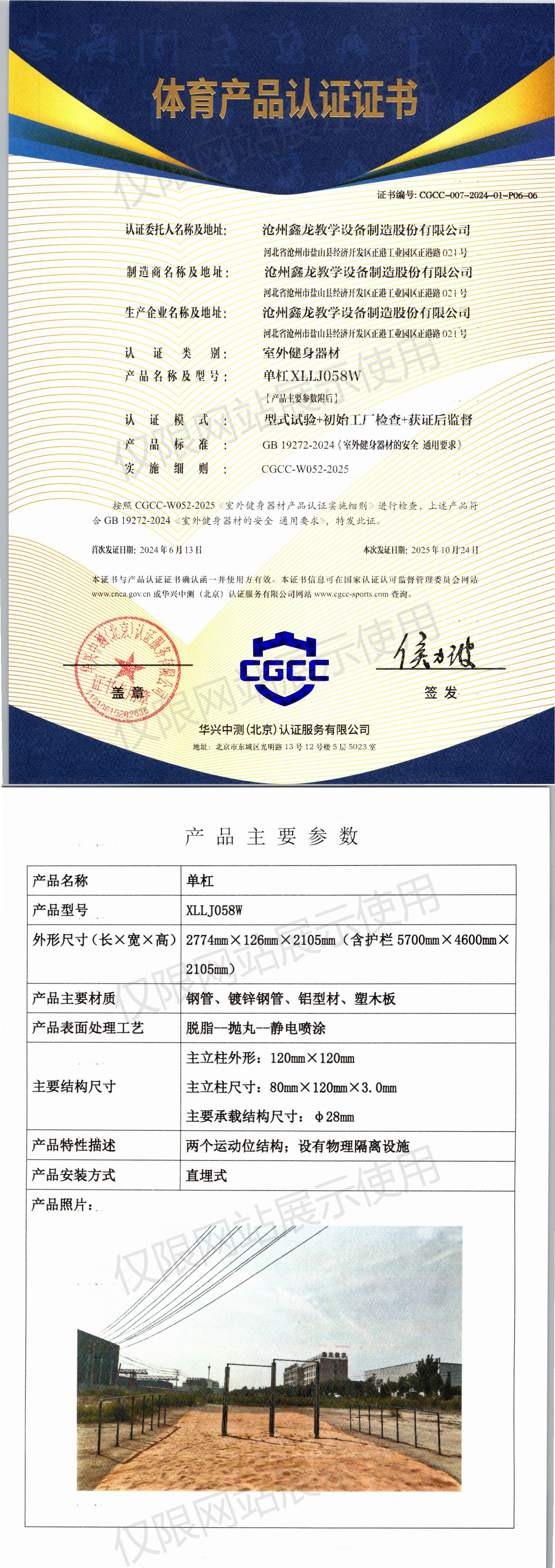 | 8 | 沧州鑫龙教学设备制造股份有限公司 | CGCC-007-2024-01-P06-06 | 单杠 | XLLJ058W | 河北省沧州市盐山县经济开发区正港工业园区正港路021号 | GB 19272-2024 | 2024-06-13 | 有效 | 查看 |