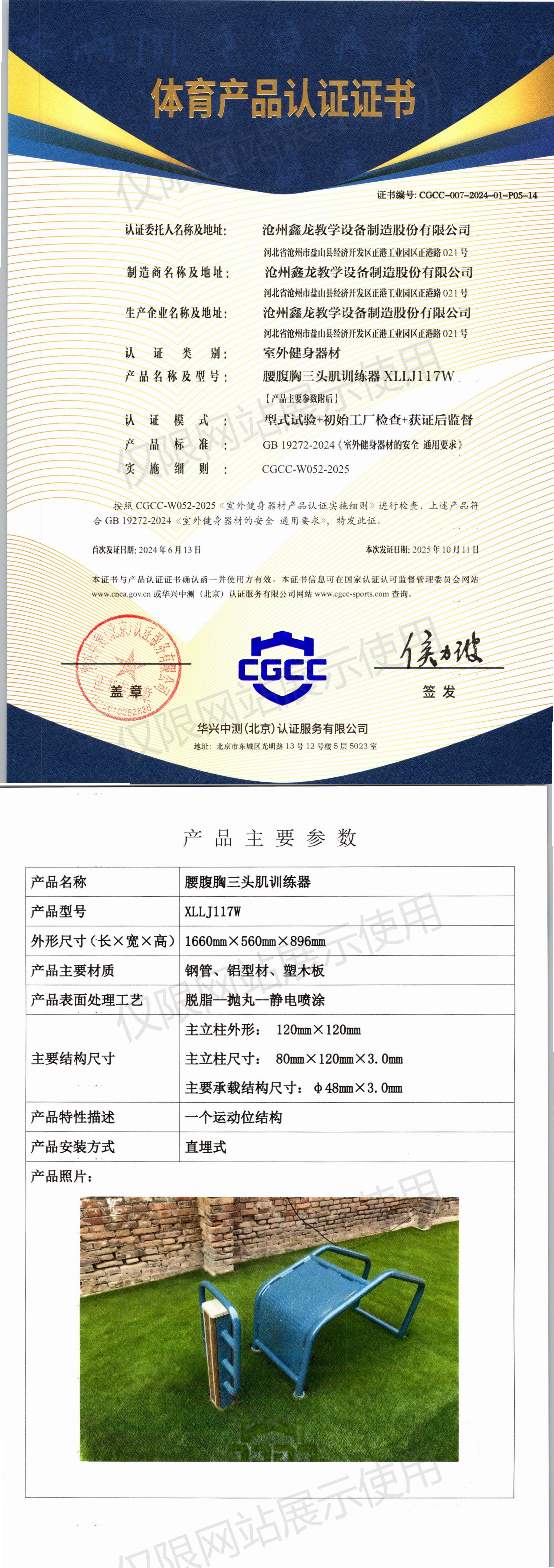 | 1 | 沧州鑫龙教学设备制造股份有限公司 | CGCC-007-2024-01-P05-14 | 腰腹胸三头肌训练器 | XLLJ117W | 河北省沧州市盐山县经济开发区正港工业园区正港路021号 | GB 19272-2024 | 2024-06-13 | 有效 | 查看 |