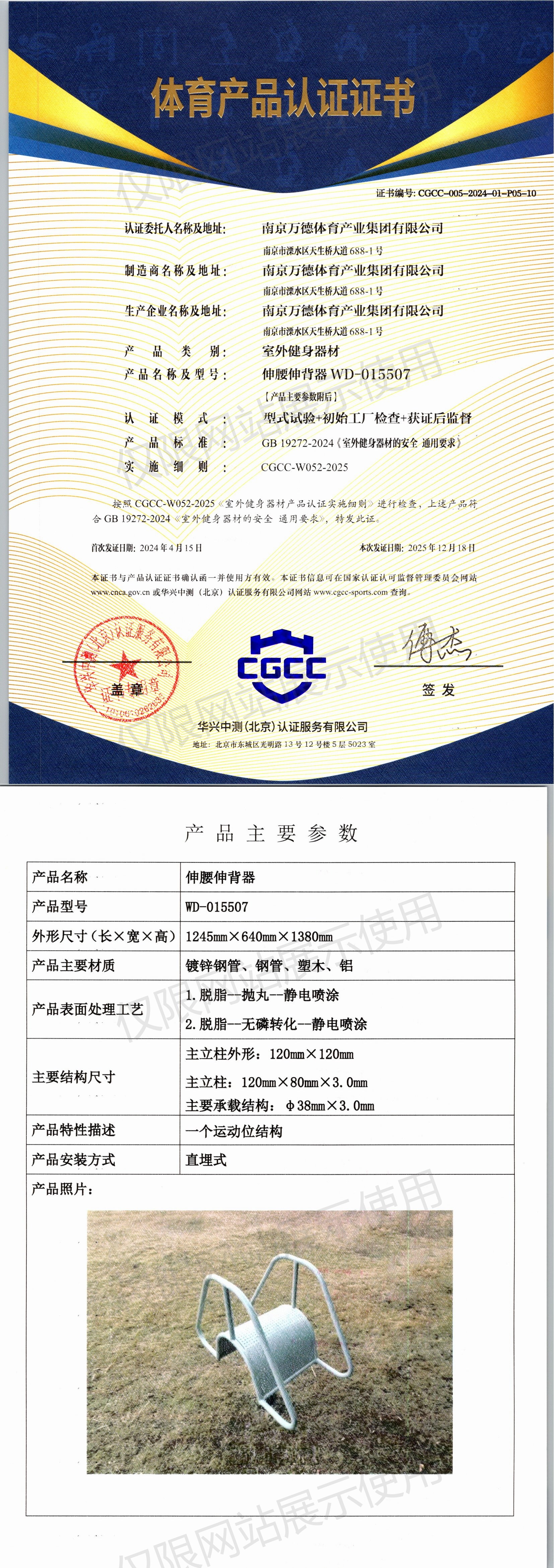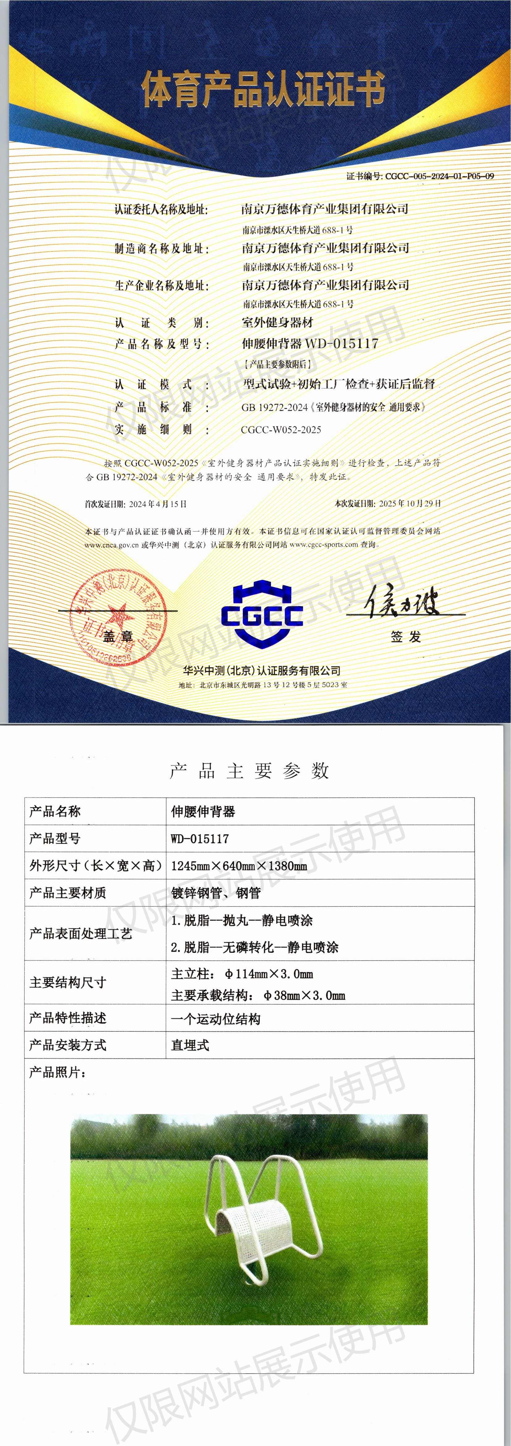 | 6 | 南京万德体育产业集团有限公司 | CGCC-005-2024-01-P05-10 | 伸腰伸背器 | WD-015507 | 南京市溧水区天生桥大道688-1号 | GB 19272-2024 | 2024-04-15 | 有效 | 查看 |