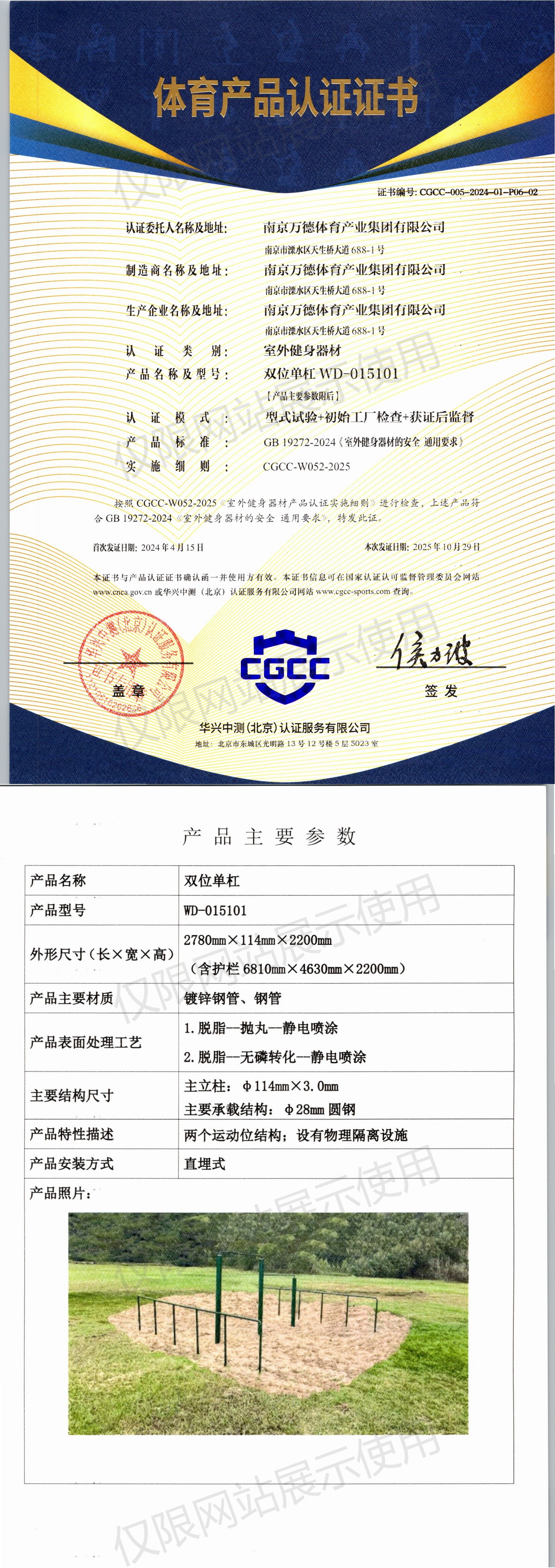 | 10 | 南京万德体育产业集团有限公司 | CGCC-005-2024-01-P06-03 | 双杠 | WD-015102 | 南京市溧水区天生桥大道688-1号 | GB 19272-2024 | 2024-04-15 | 有效 | 查看 |