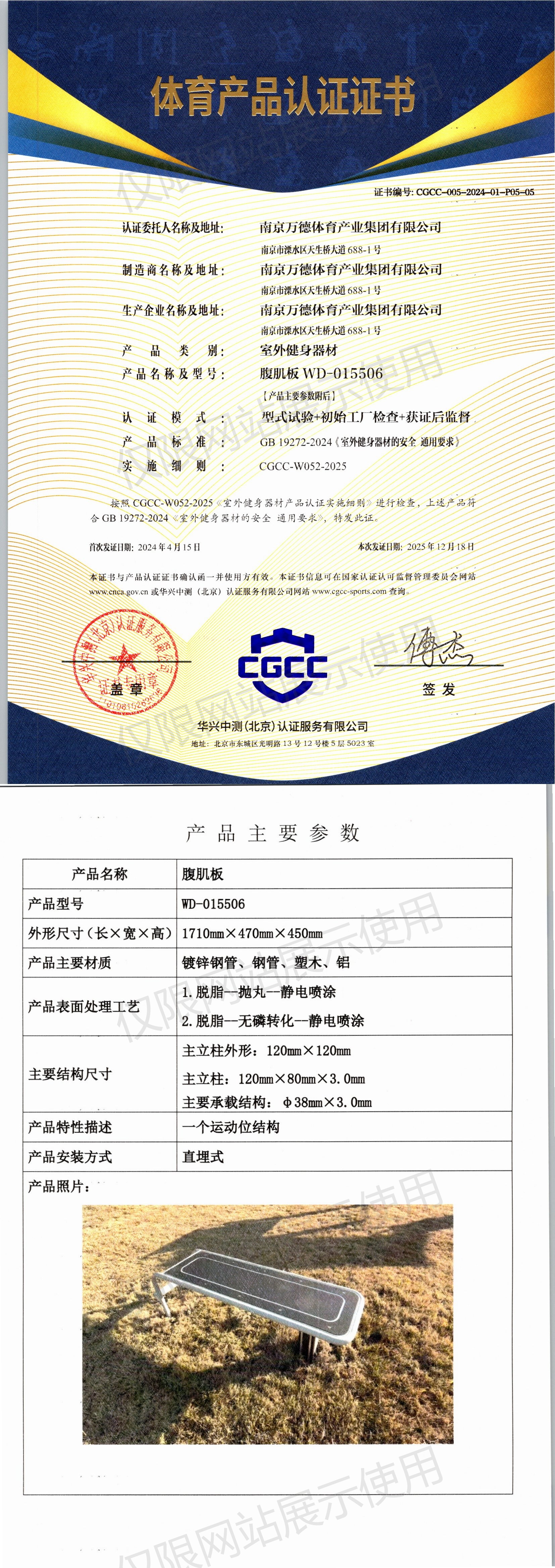 | 1 | 南京万德体育产业集团有限公司 | CGCC-005-2024-01-P05-05 | 腹肌板 | WD-015506 | 南京市溧水区天生桥大道688-1号 | GB 19272-2024 | 2024-04-15 | 有效 | 查看 |