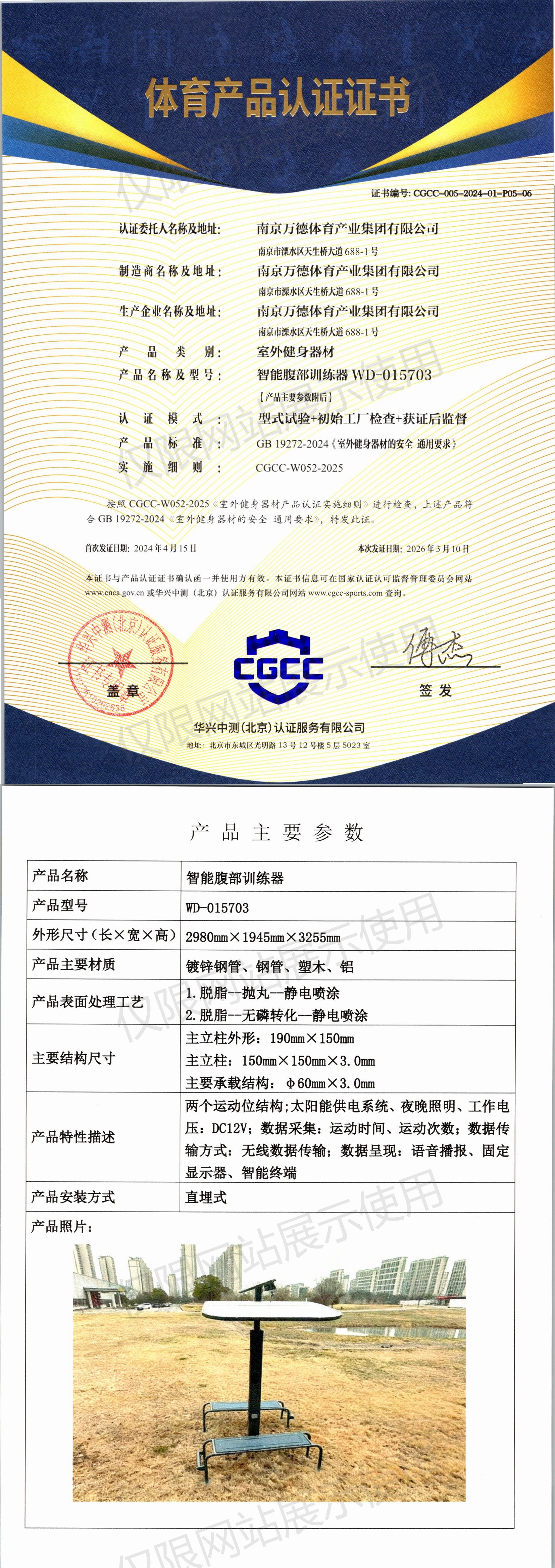 | 2 | 南京万德体育产业集团有限公司 | CGCC-005-2024-01-P05-06 | 智能腹部训练器 | WD-014219 | 南京市溧水区天生桥大道688-1号 | GB 19272-2024 | 2024-04-15 | 有效 | 查看 |