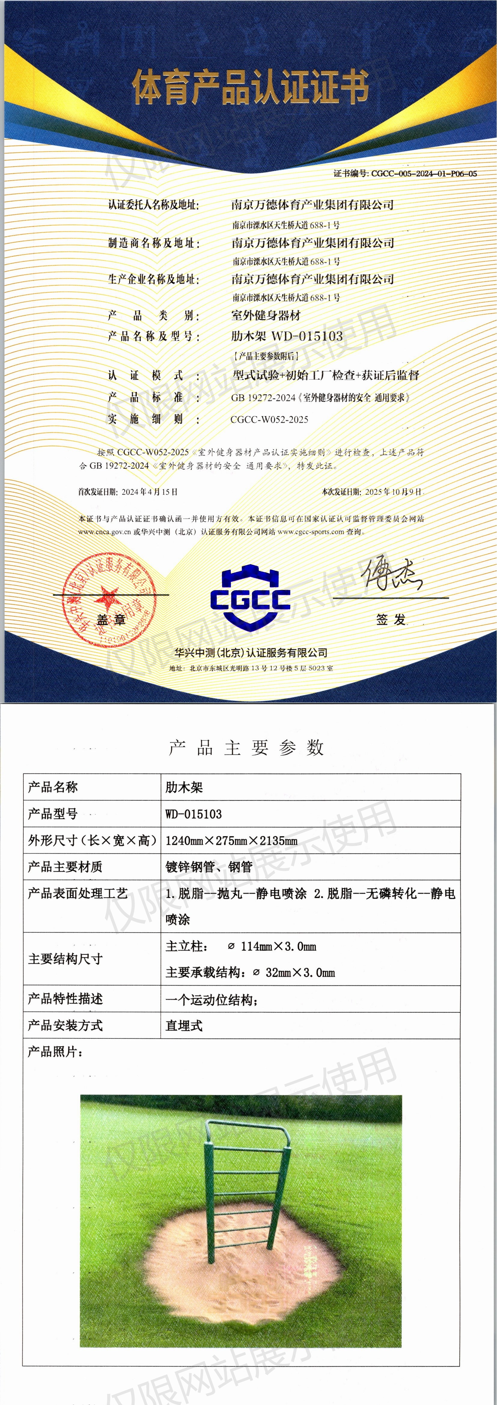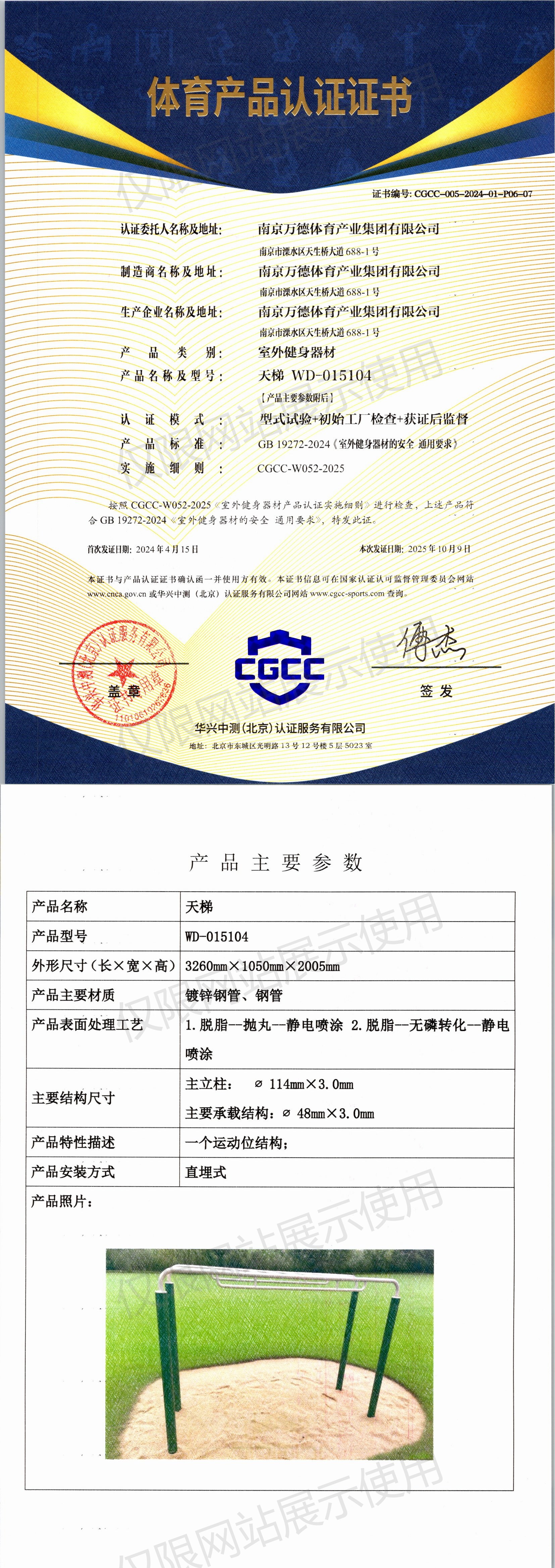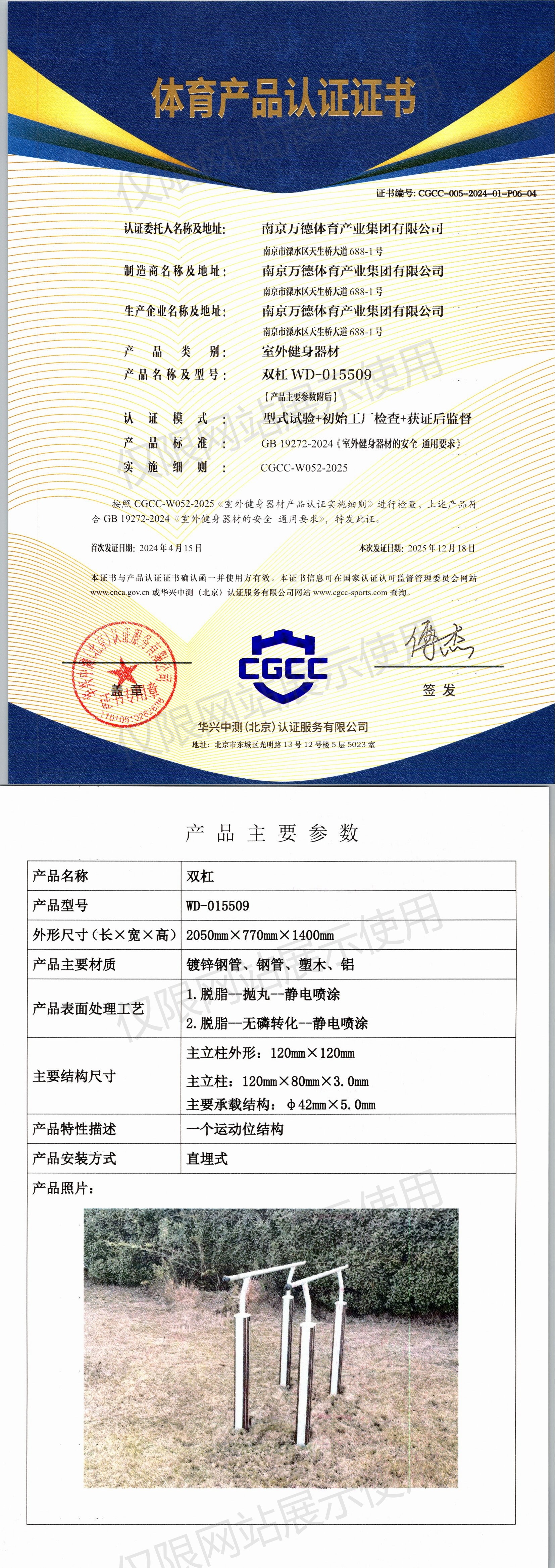 | 1 | 南京万德体育产业集团有限公司 | CGCC-005-2024-01-P06-04 | 双杠 | WD-015509 | 南京市溧水区天生桥大道688-1号 | GB 19272-2024 | 2024-04-15 | 有效 | 查看 |