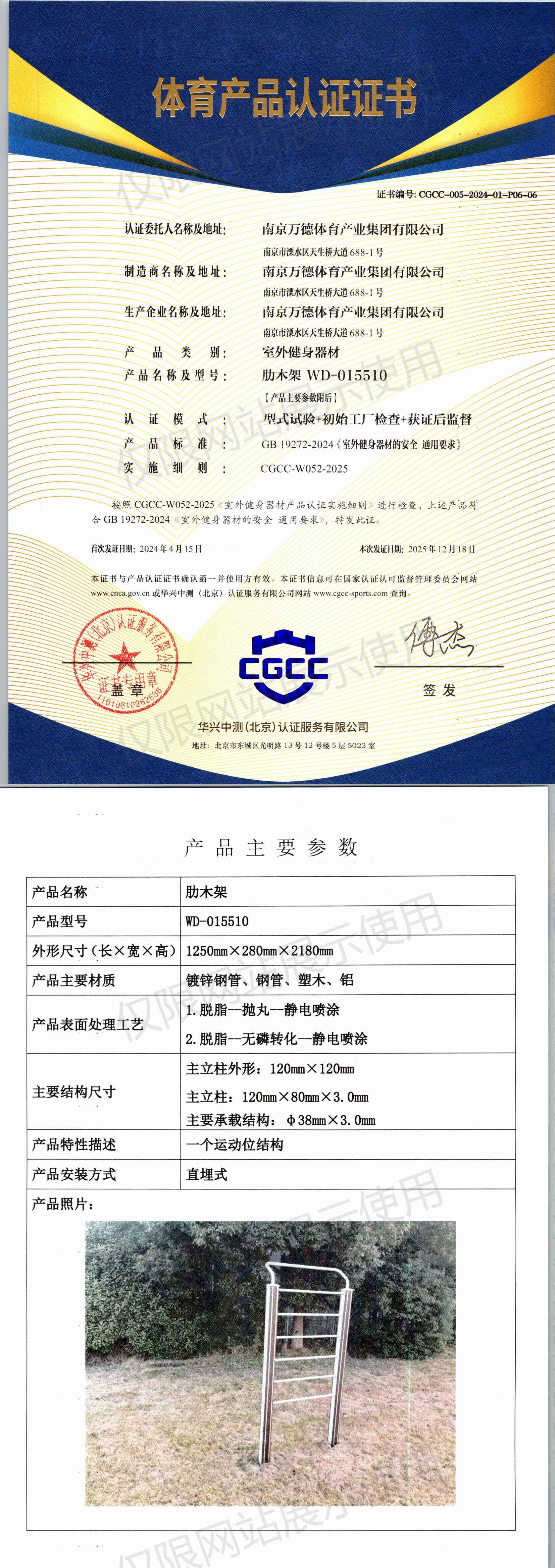 | 3 | 南京万德体育产业集团有限公司 | CGCC-005-2024-01-P06-06 | 肋木架 | WD-015510 | 南京市溧水区天生桥大道688-1号 | GB 19272-2024 | 2024-04-15 | 有效 | 查看 |