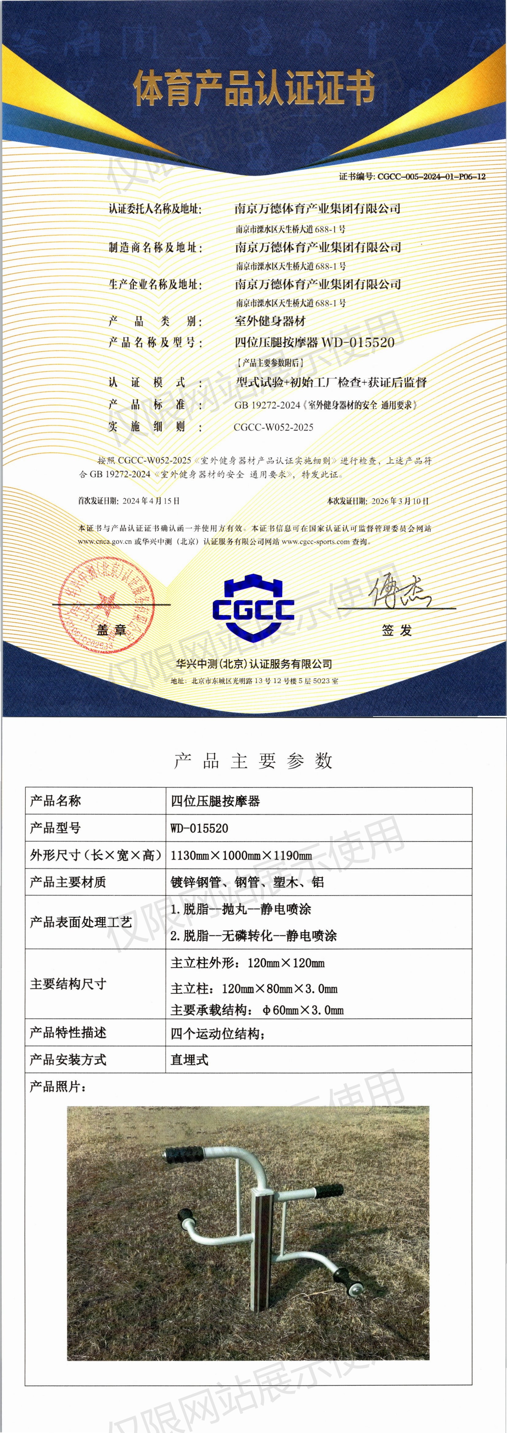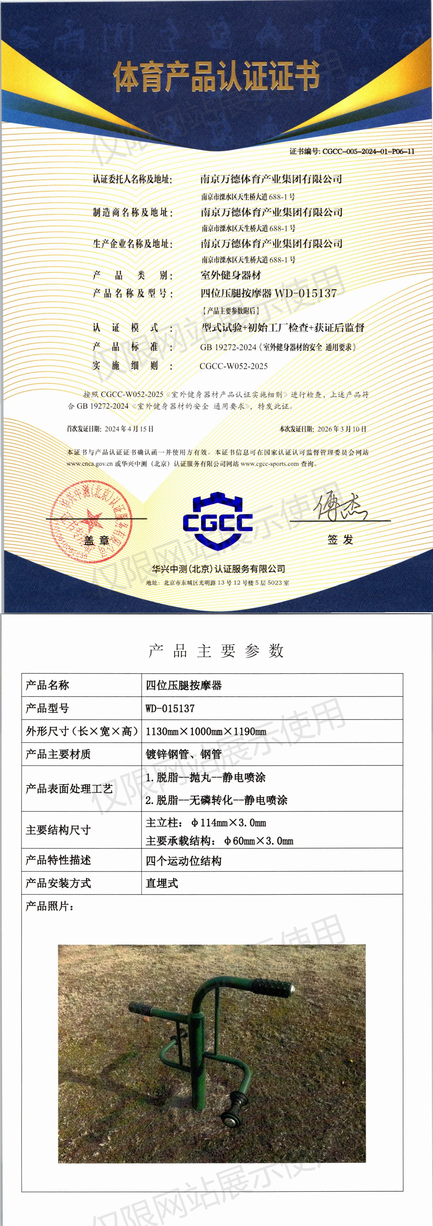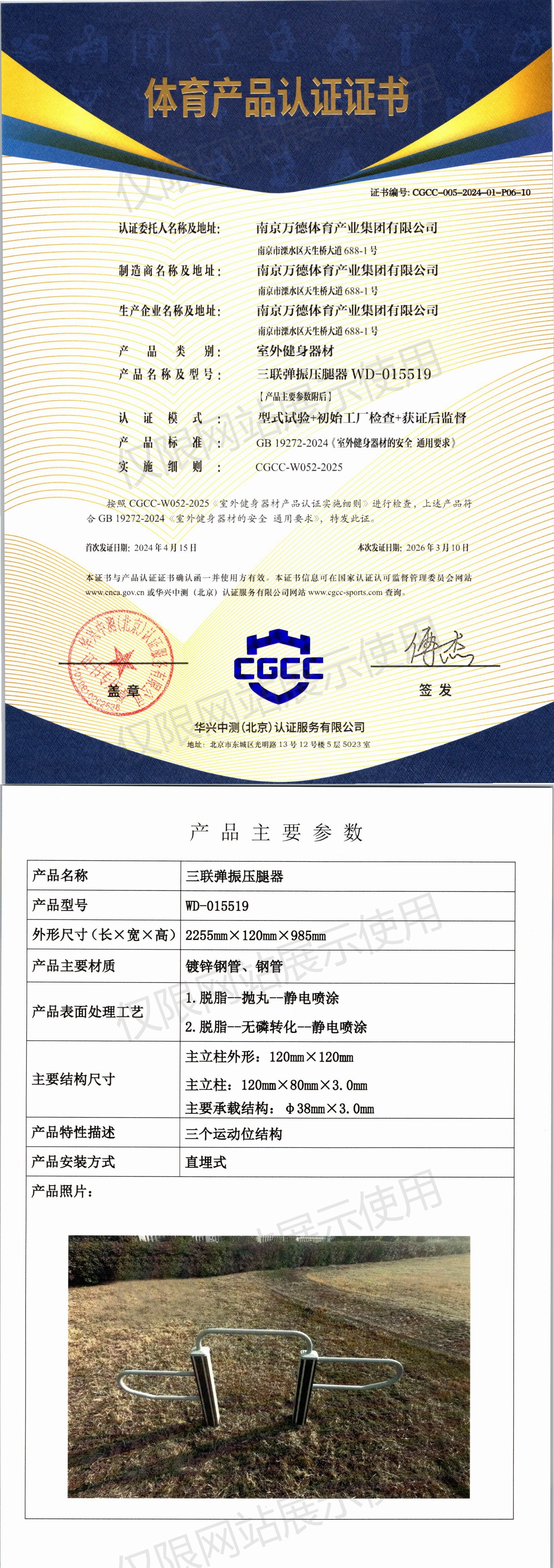 | 7 | 南京万德体育产业集团有限公司 | CGCC-005-2024-01-P06-10 | 三联弹振压腿器 | WD-015519 | 南京市溧水区天生桥大道688-1号 | GB 19272-2024 | 2024-04-15 | 有效 | 查看 |