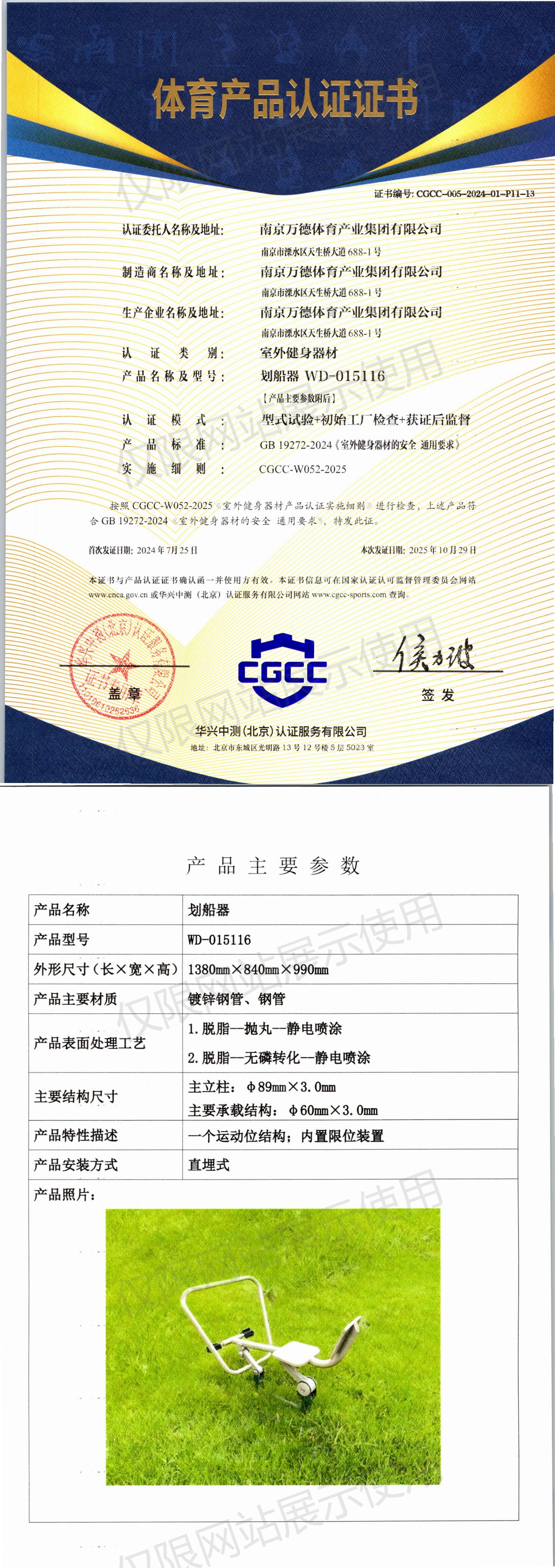 | 8 | 南京万德体育产业集团有限公司 | CGCC-005-2024-01-P11-13 | 划船器 | WD-015116 | 南京市溧水区天生桥大道688-1号 | GB 19272-2024 | 2024-07-25 | 有效 | 查看 |