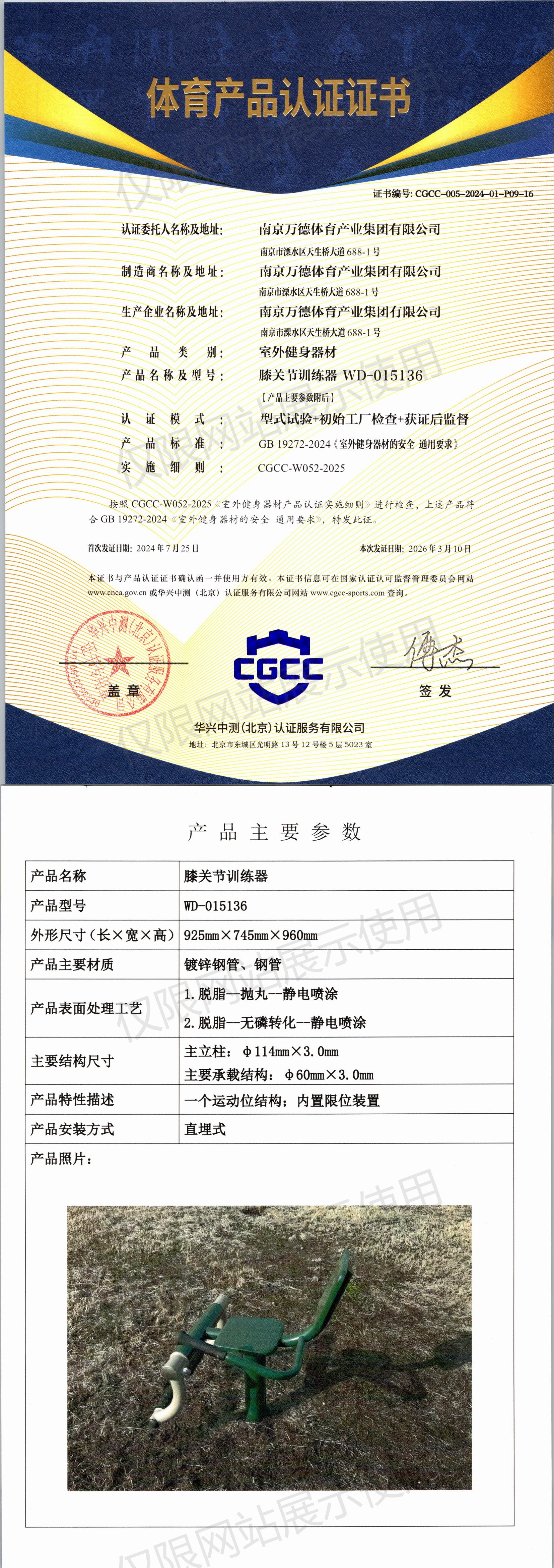 | 4 | 南京万德体育产业集团有限公司 | CGCC-005-2024-01-P09-16 | 膝关节训练器 | WD-015136 | 南京市溧水区天生桥大道688-1号 | GB 19272-2024 | 2024-07-25 | 有效 | 查看 |