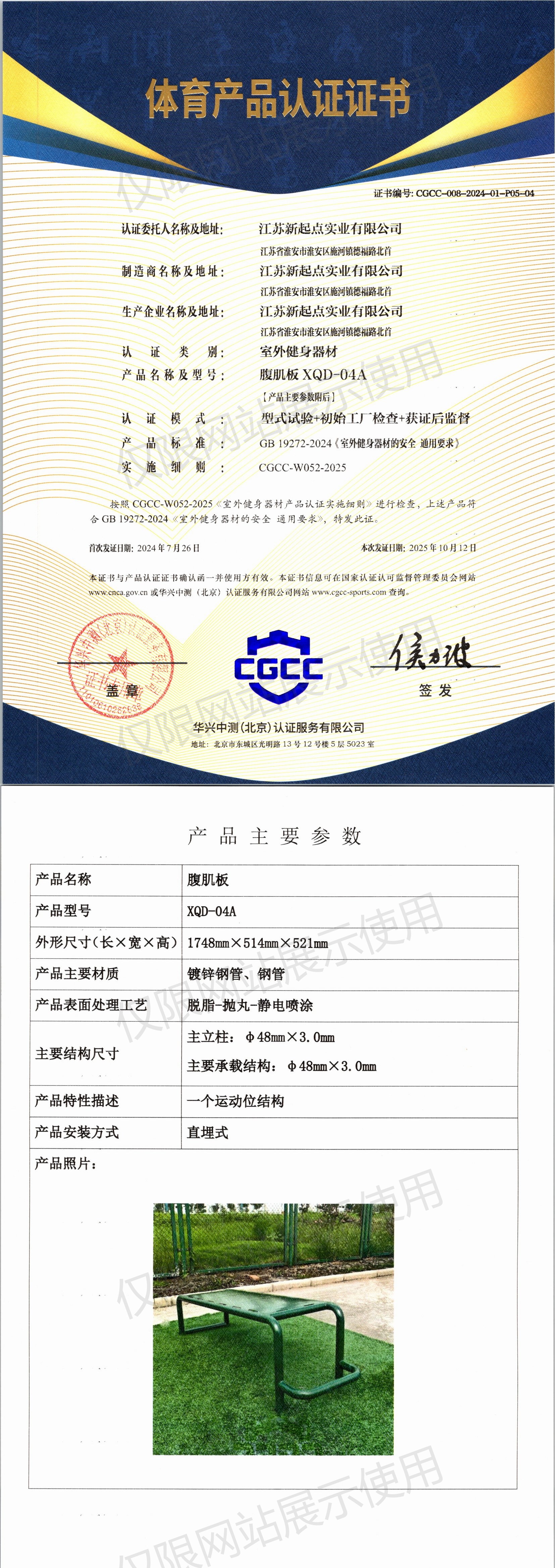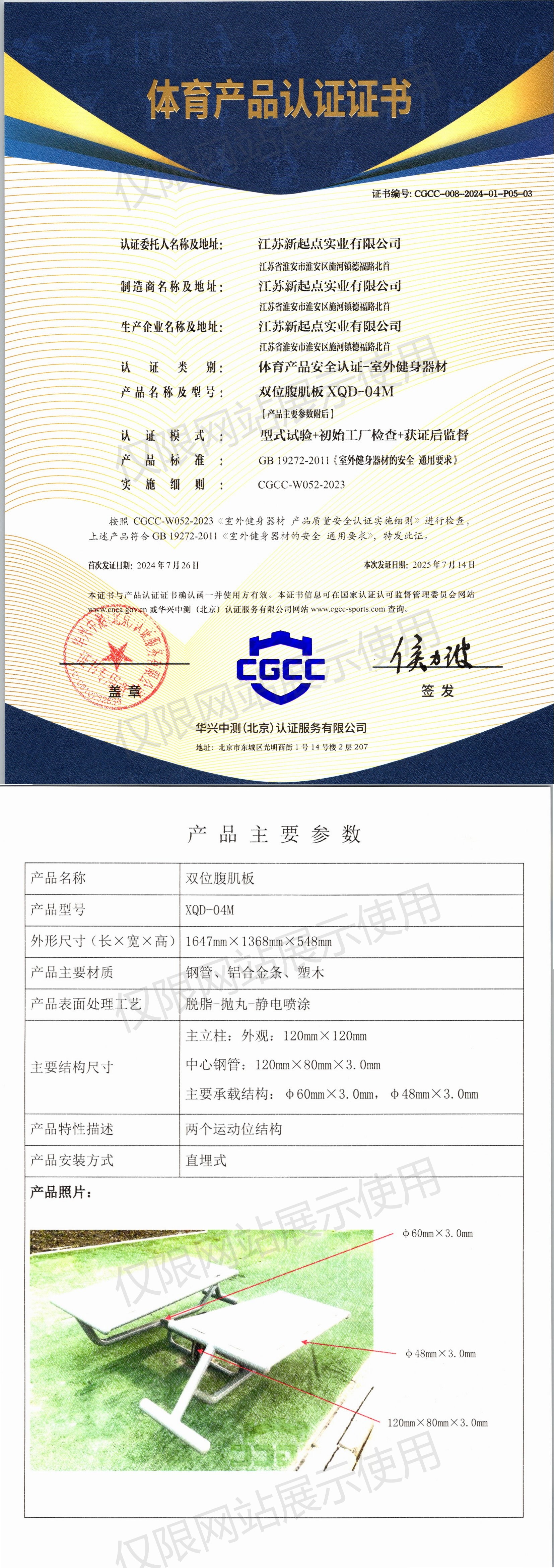| 9 | 江苏新起点实业有限公司 | CGCC-008-2024-01-P05-03 | 双位腹肌板 | XQD-04M | 江苏省淮安市淮安区施河镇德福路北首 | GB19272-2011 | 2024-07-26 | 有效 | 查看 |