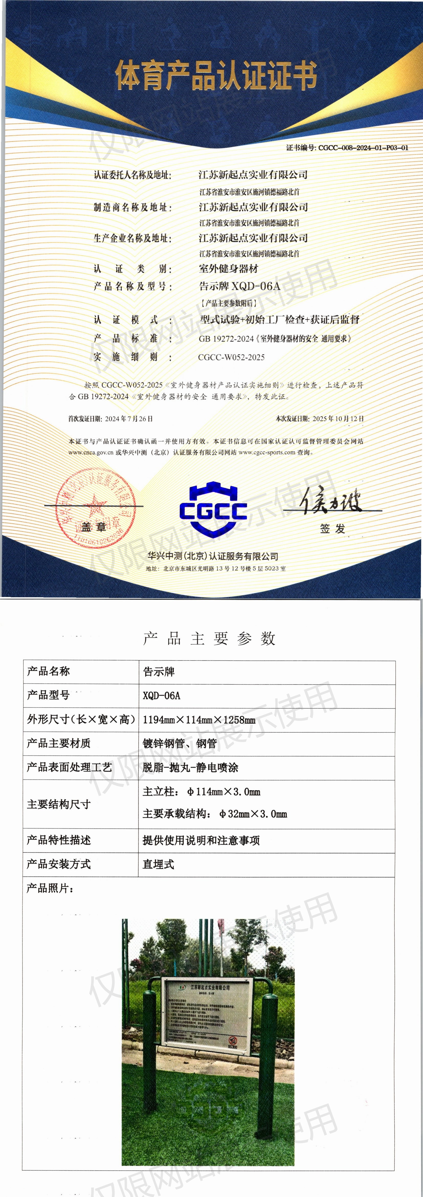 | 4 | 江苏新起点实业有限公司 | CGCC-008-2024-01-P03-03 | 告示牌 | XQD-06M | 江苏省淮安市淮安区施河镇德福路北首 | GB 19272-2024 | 2024-07-26 | 有效 | 查看 |