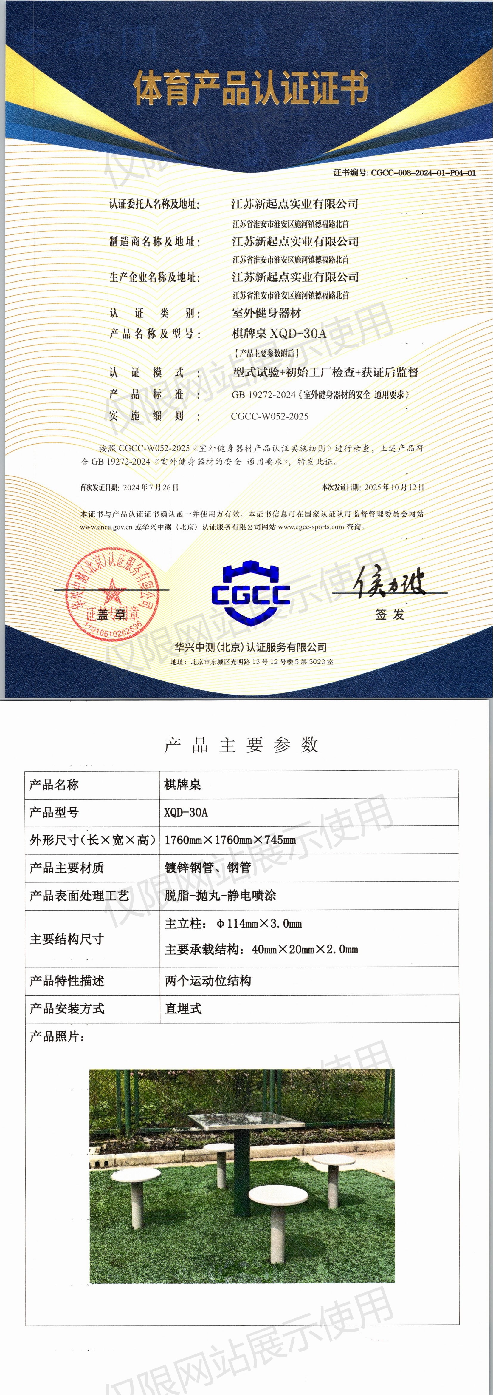 | 5 | 江苏新起点实业有限公司 | CGCC-008-2024-01-P04-01 | 棋牌桌 | XQD-30A | 江苏省淮安市淮安区施河镇德福路北首 | GB 19272-2024 | 2024-07-26 | 有效 | 查看 |