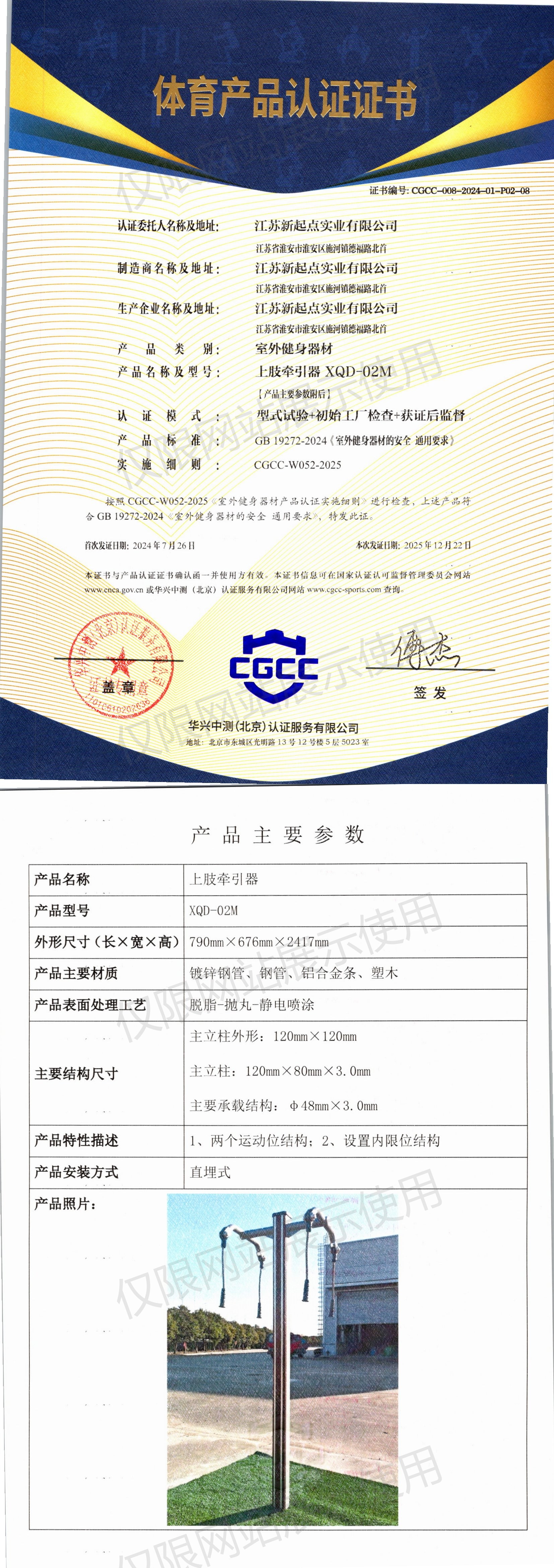 | 1 | 江苏新起点实业有限公司 | CGCC-008-2024-01-P02-08 | 上肢牵引器 | XQD-02M | 江苏省淮安市淮安区施河镇德福路北首 | GB 19272-2024 | 2024-07-26 | 有效 | 查看 |