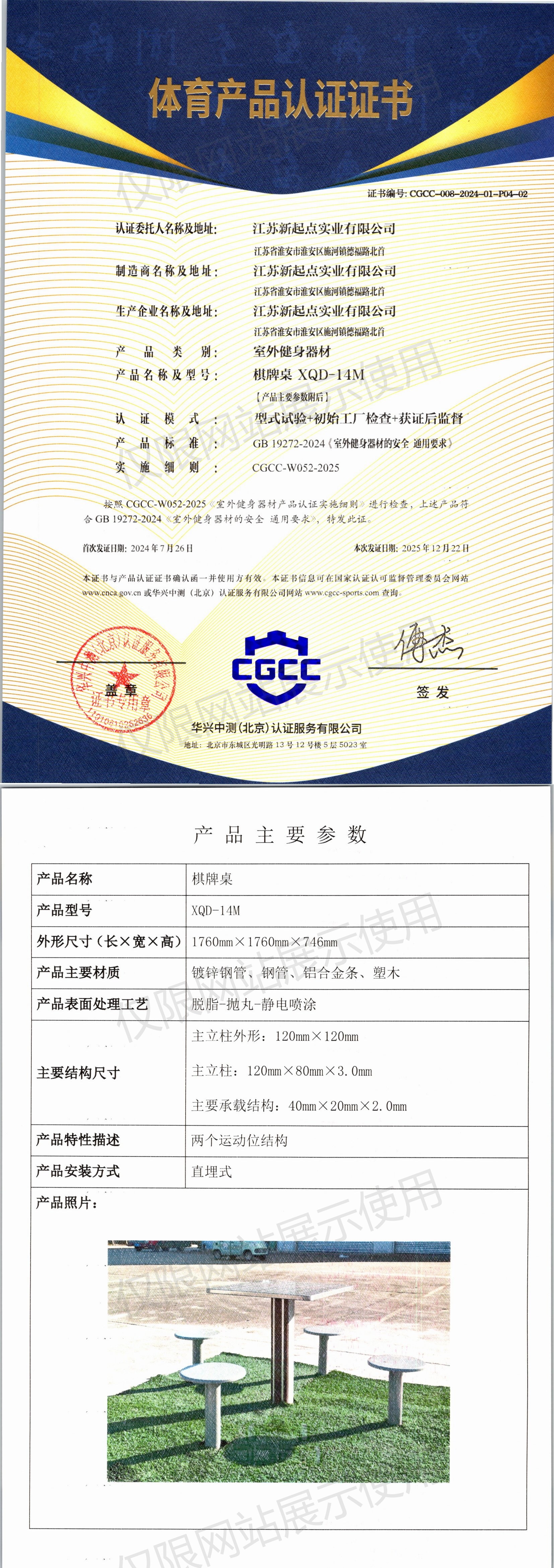 | 6 | 江苏新起点实业有限公司 | CGCC-008-2024-01-P04-02 | 棋牌桌 | XQD-14M | 江苏省淮安市淮安区施河镇德福路北首 | GB 19272-2024 | 2024-07-26 | 有效 | 查看 |