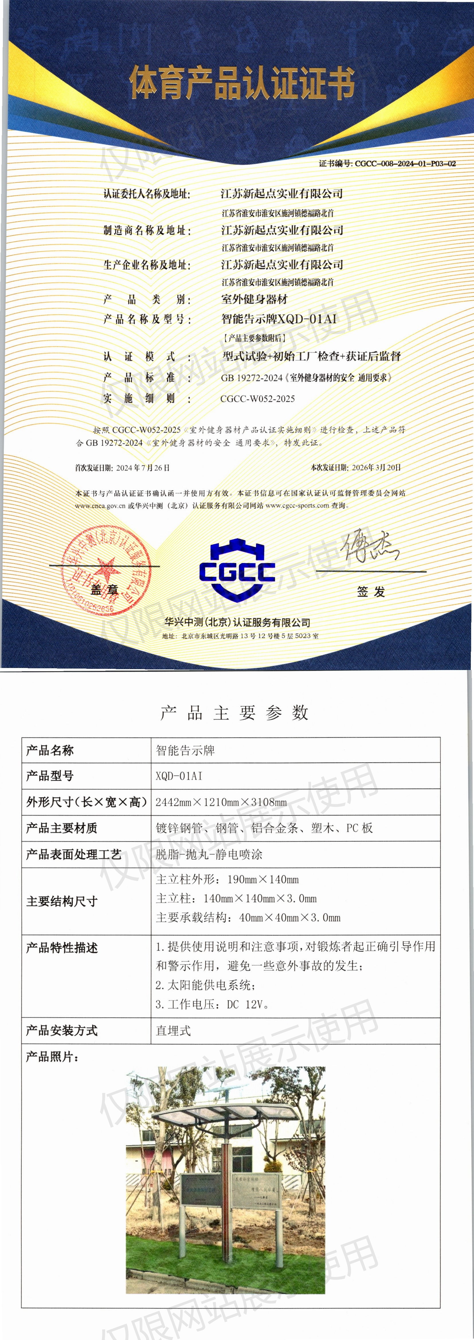 | 3 | 江苏新起点实业有限公司 | CGCC-008-2024-01-P03-02 | 智能告示牌 | XQD-01AI | 江苏省淮安市淮安区施河镇德福路北首 | GB19272-2024 | 2024-07-26 | 有效 | 查看 |