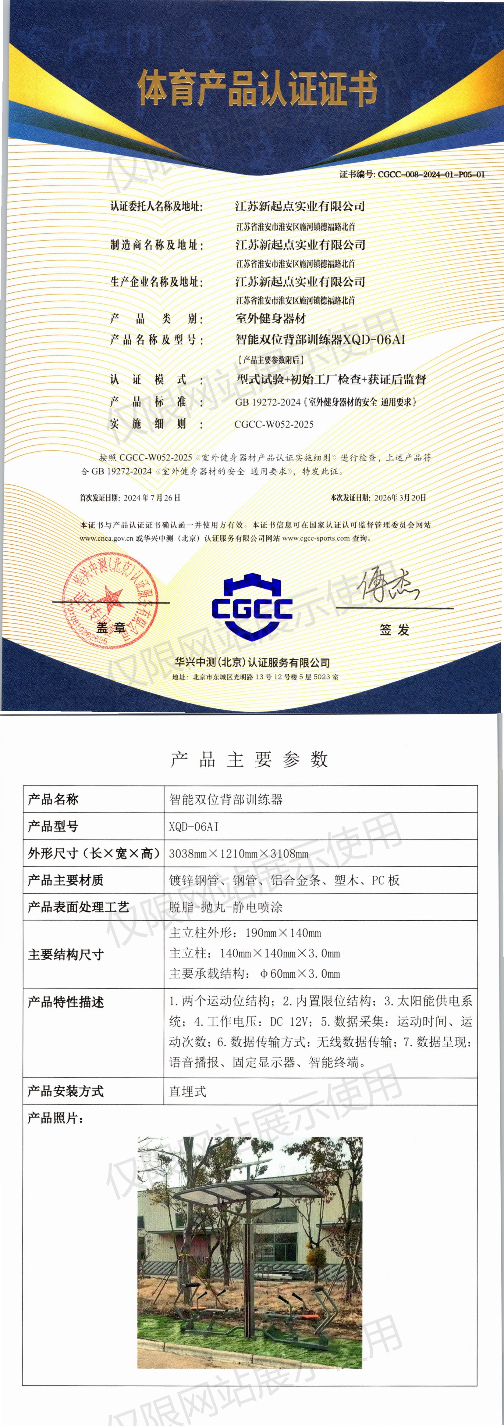 | 7 | 江苏新起点实业有限公司 | CGCC-008-2024-01-P05-01 | 智能双位背部训练器 | XQD-06AI | 江苏省淮安市淮安区施河镇德福路北首 | GB19272-2024 | 2024-07-26 | 有效 | 查看 |