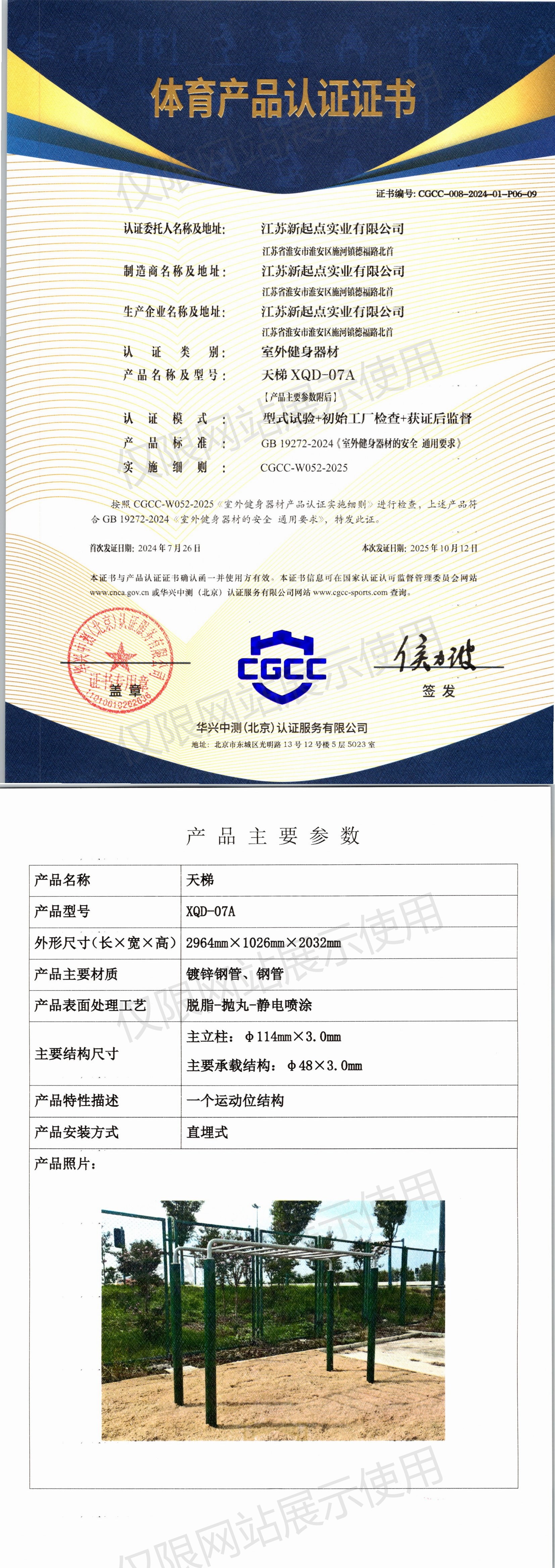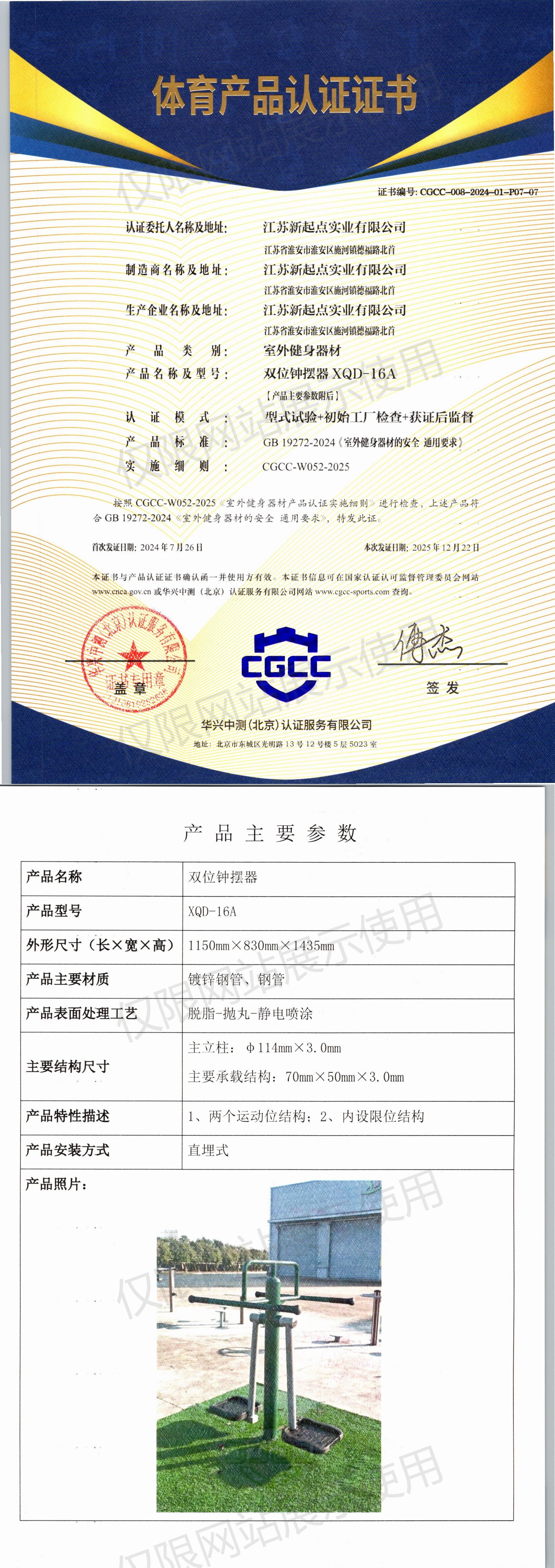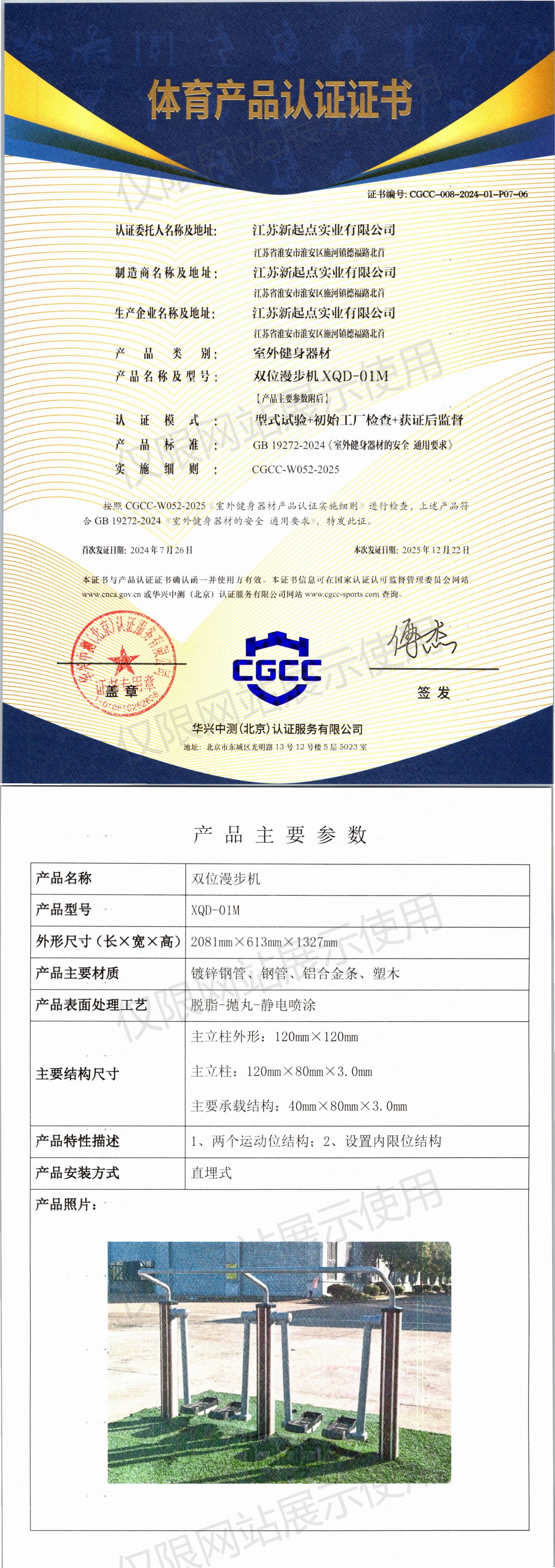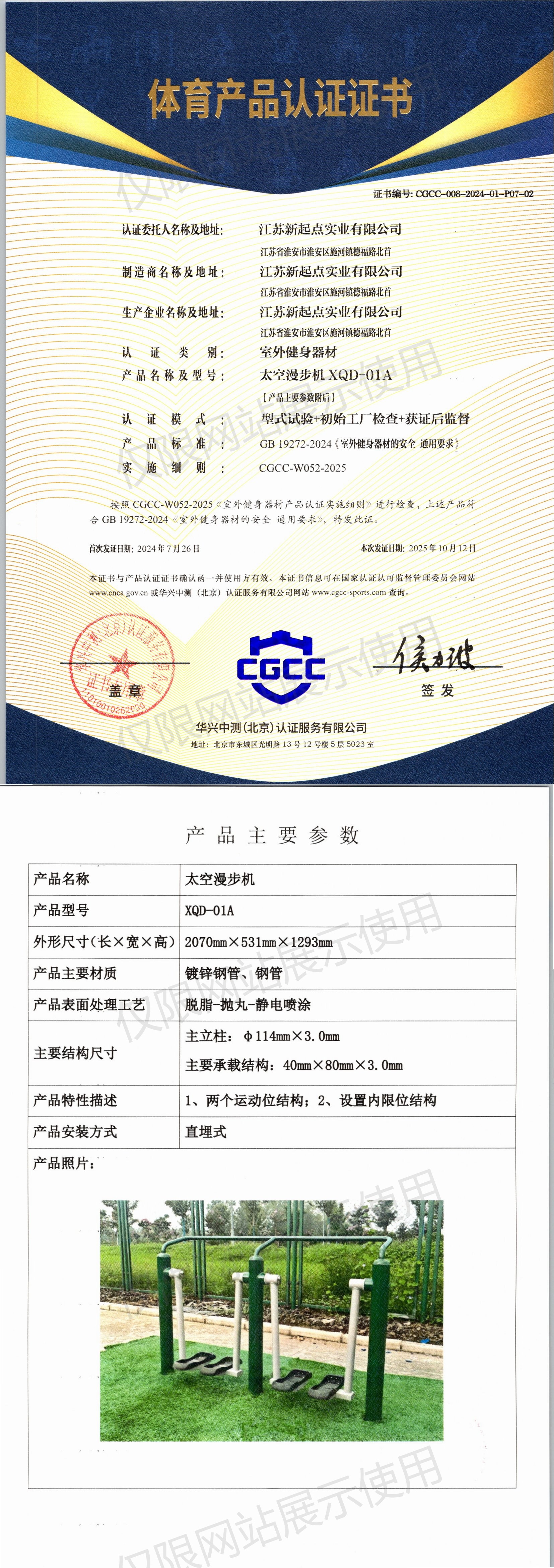 | 4 | 江苏新起点实业有限公司 | CGCC-008-2024-01-P07-02 | 太空漫步机 | XQD-01A | 江苏省淮安市淮安区施河镇德福路北首 | GB 19272-2024 | 2024-07-26 | 有效 | 查看 |