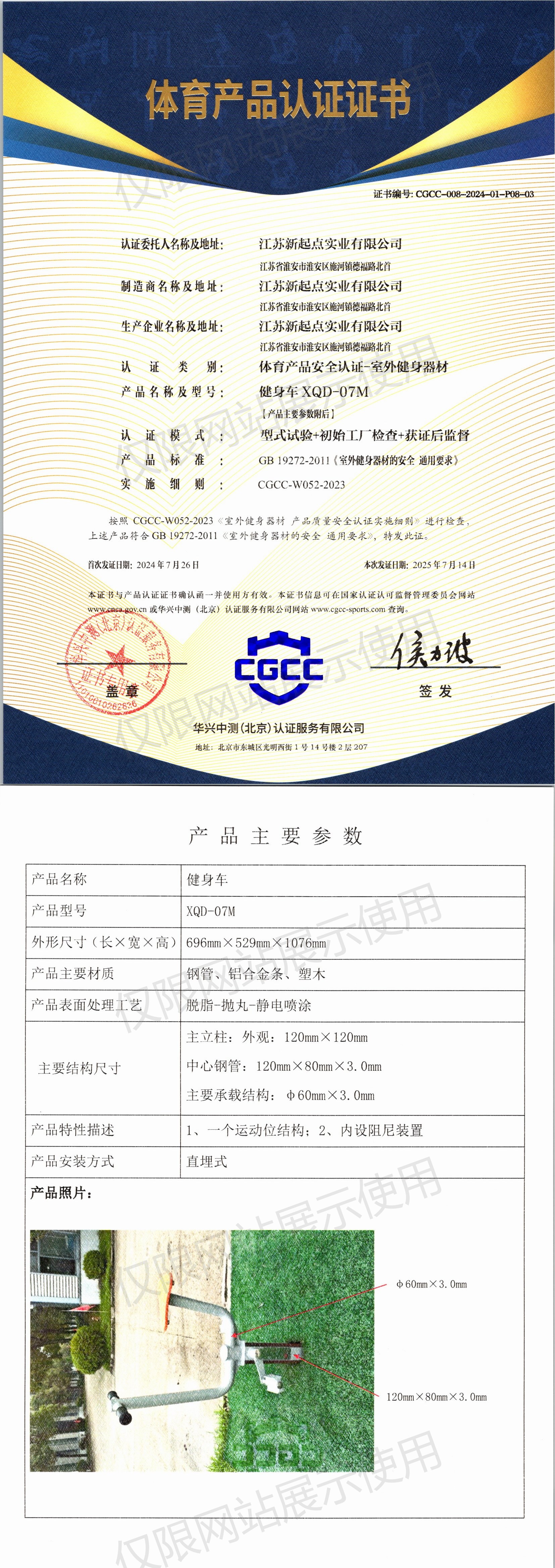| 2 | 江苏新起点实业有限公司 | CGCC-008-2024-01-P08-02 | 智能双位竞赛健身车 | XQD-04AI | 江苏省淮安市淮安区施河镇德福路北首 | GB19272-2024 | 2024-07-26 | 有效 | 查看 |