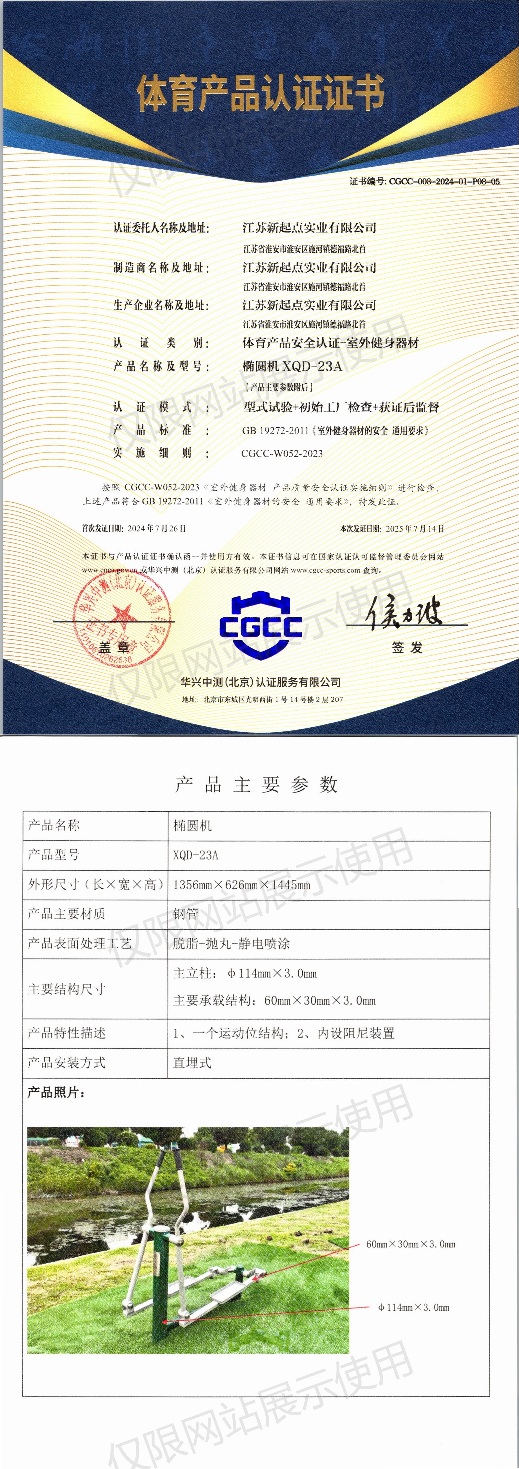 | 6 | 江苏新起点实业有限公司 | CGCC-008-2024-01-P08-06 | 智能双位椭圆机 | XQD-05AI | 江苏省淮安市淮安区施河镇德福路北首 | GB19272-2024 | 2024-07-26 | 有效 | 查看 |