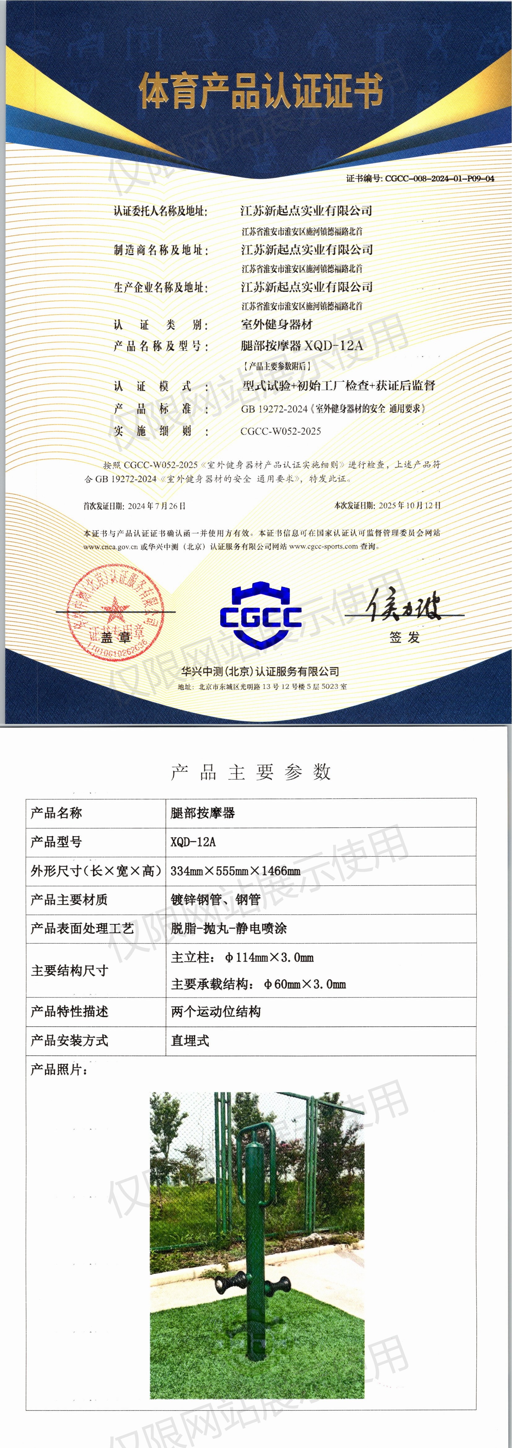 | 10 | 江苏新起点实业有限公司 | CGCC-008-2024-01-P09-04 | 腿部按摩器 | XQD-12A | 江苏省淮安市淮安区施河镇德福路北首 | GB 19272-2024 | 2024-07-26 | 有效 | 查看 |