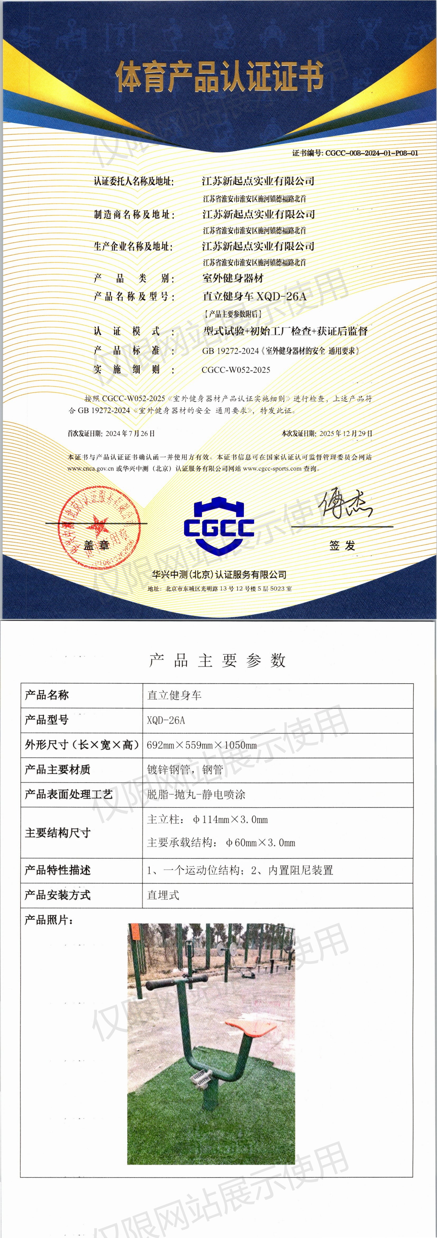 | 1 | 江苏新起点实业有限公司 | CGCC-008-2024-01-P08-01 | 直立健身车 | XQD-26A | 江苏省淮安市淮安区施河镇德福路北首 | GB 19272-2024 | 2024-07-26 | 有效 | 查看 |