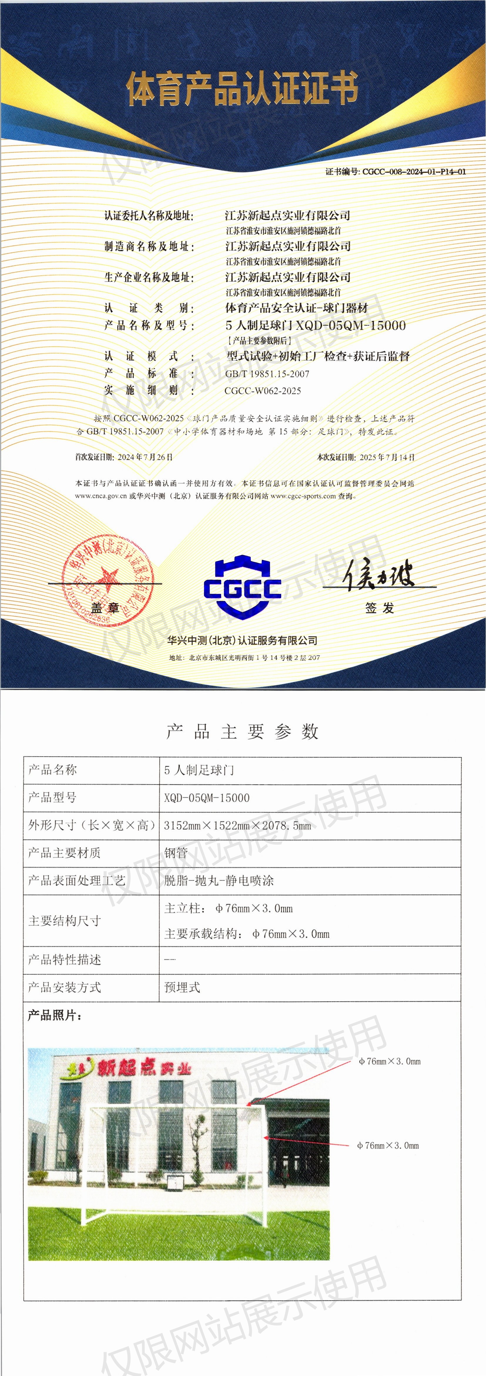 | 6 | 江苏新起点实业有限公司 | CGCC-008-2024-01-P14-01 | 5人制足球门 | XQD-05QM-15000 | 江苏省淮安市淮安区施河镇德福路北首 | GB/T 19851.15-2007 | 2024-07-26 | 有效 | 查看 |