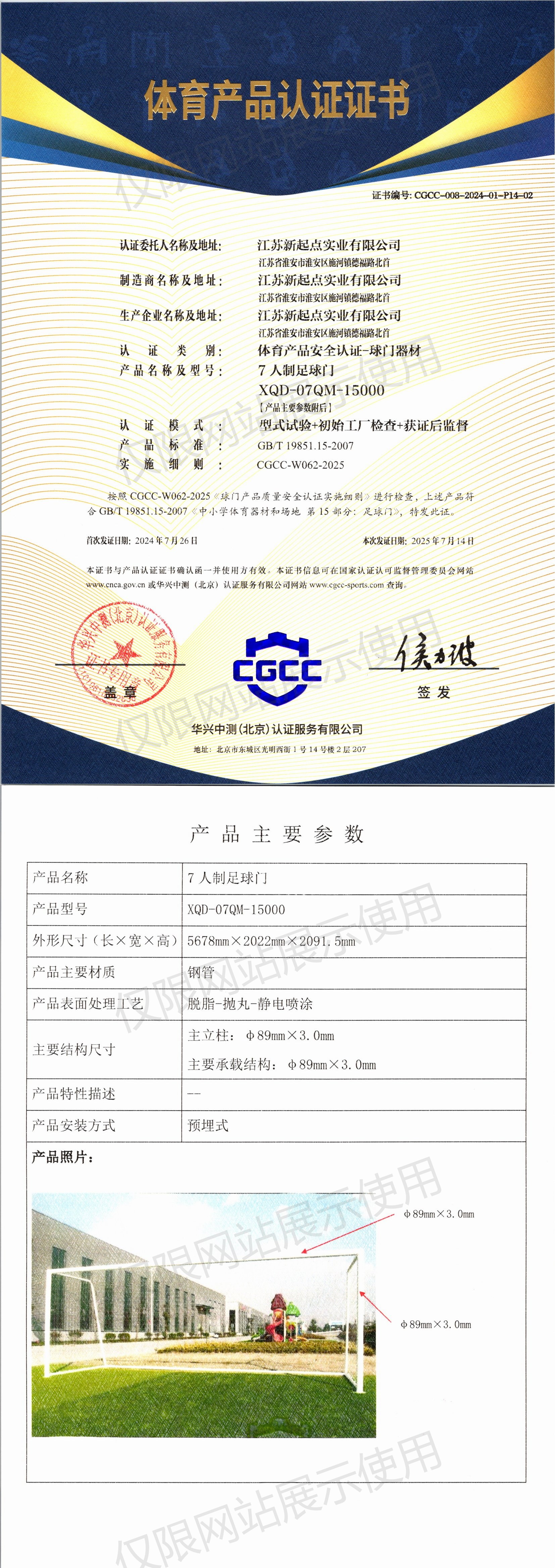 | 7 | 江苏新起点实业有限公司 | CGCC-008-2024-01-P14-02 | 7人制足球门 | XQD-07QM-15000 | 江苏省淮安市淮安区施河镇德福路北首 | GB/T 19851.15-2007 | 2024-07-26 | 有效 | 查看 |