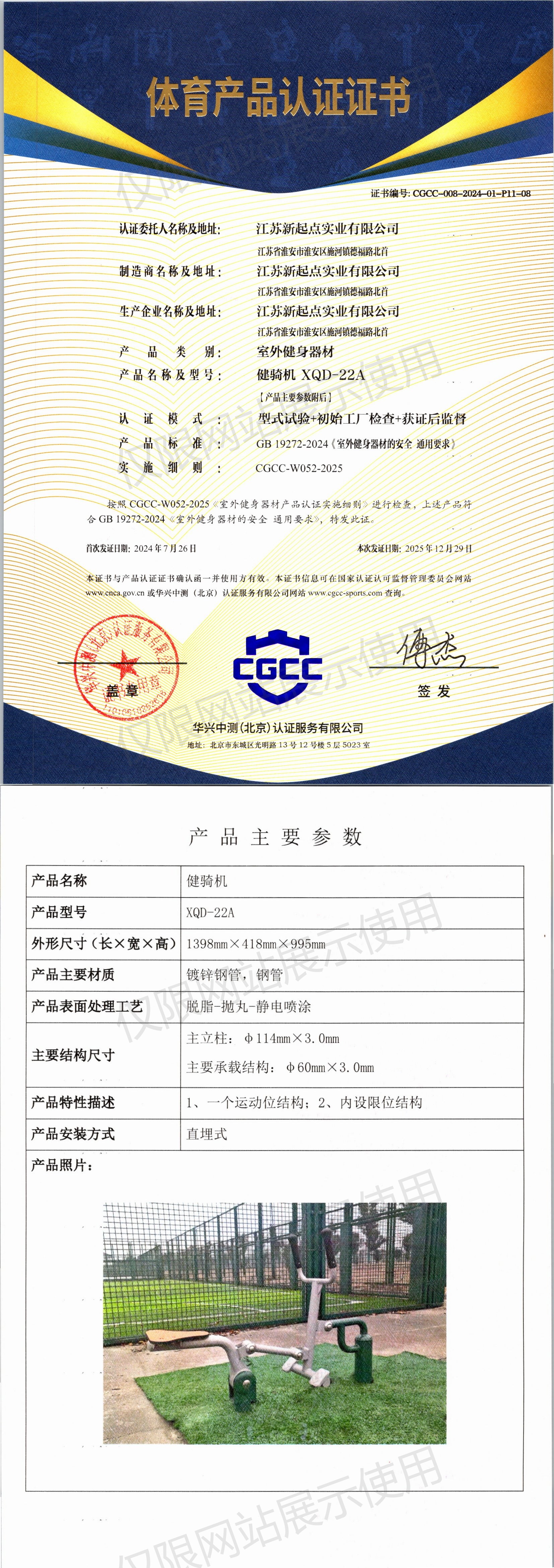| 1 | 江苏新起点实业有限公司 | CGCC-008-2024-01-P11-08 | 健骑机 | XQD-22A | 江苏省淮安市淮安区施河镇德福路北首 | GB 19272-2024 | 2024-07-26 | 有效 | 查看 |