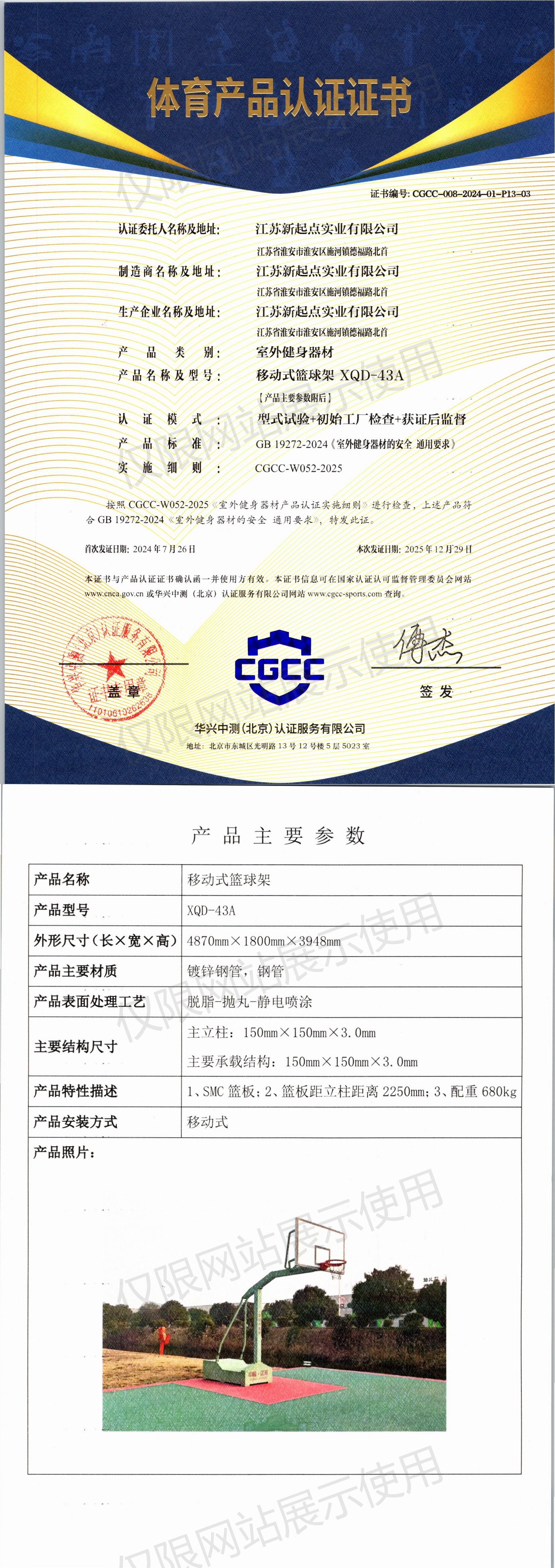| 5 | 江苏新起点实业有限公司 | CGCC-008-2024-01-P13-03 | 移动式篮球架 | XQD-43A | 江苏省淮安市淮安区施河镇德福路北首 | GB 19272-2024 | 2024-07-26 | 有效 | 查看 |