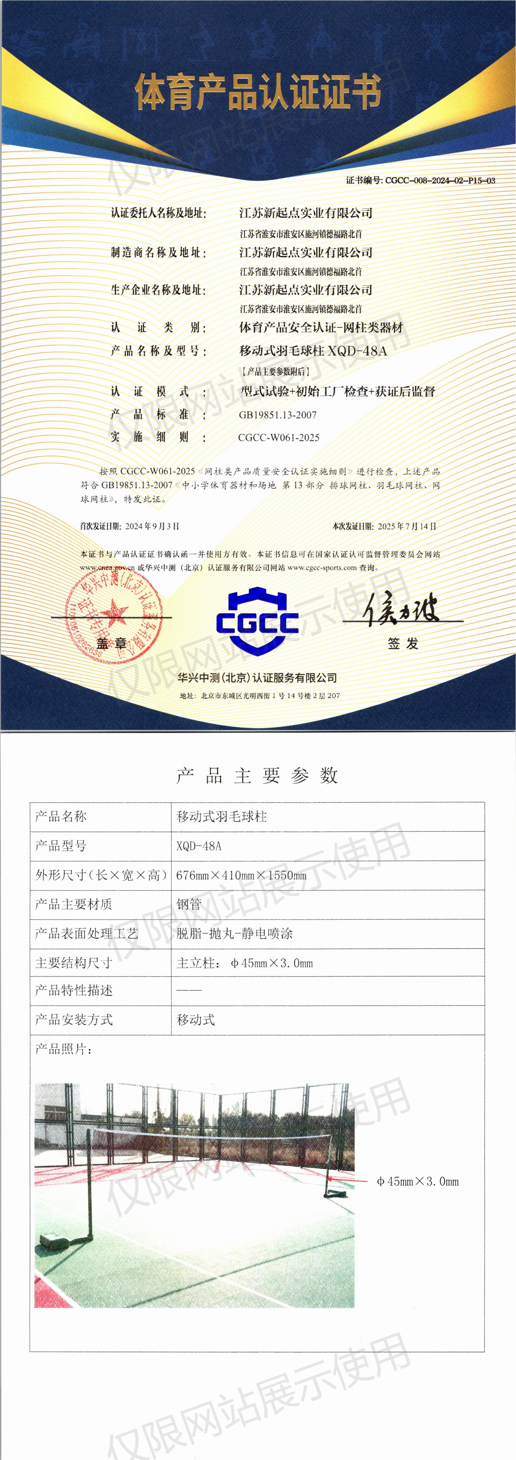 | 6 | 江苏新起点实业有限公司 | CGCC-008-2024-02-P15-03 | 移动式羽毛球柱 | XQD-48A | 江苏省淮安市淮安区施河镇德福路北首 | GB/T 19851.13-2007 | 2024-09-03 | 有效 | 查看 |
