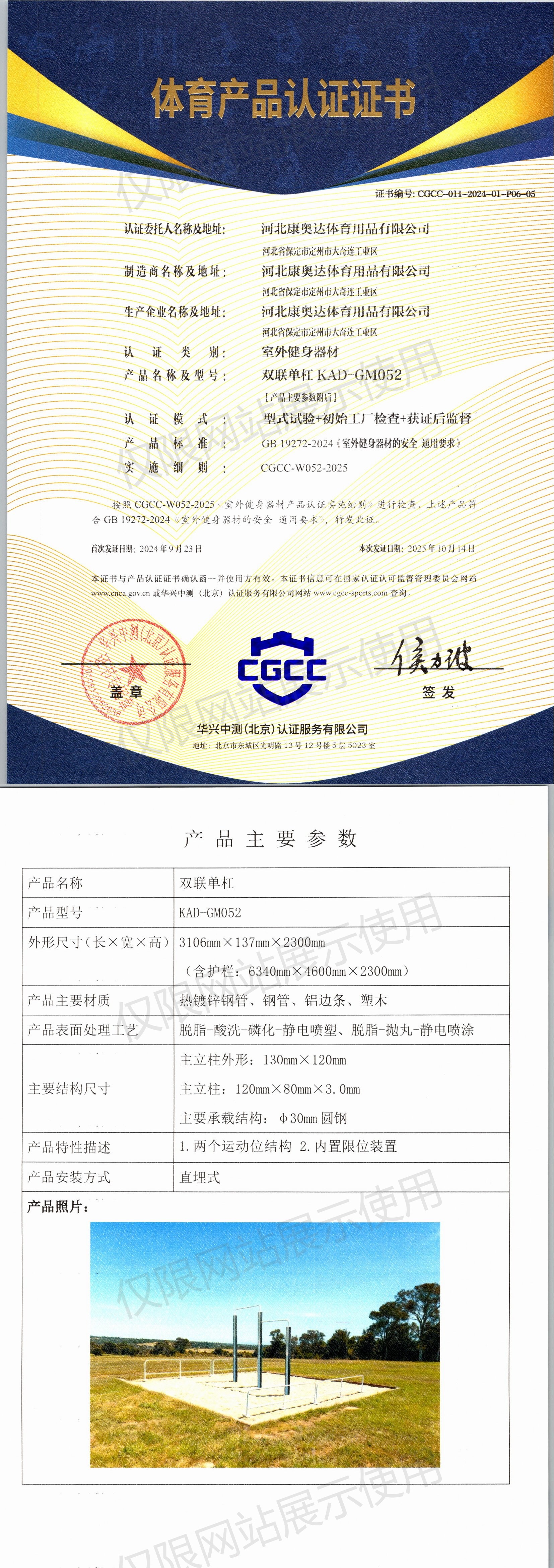 | 2 | 河北康奥达体育用品有限公司 | CGCC-011-2024-01-P06-05 | 双联单杠 | KAD-GM052 | 河北省保定市定州市大奇连工业区 | GB 19272-2024 | 2024-09-23 | 有效 | 查看 |