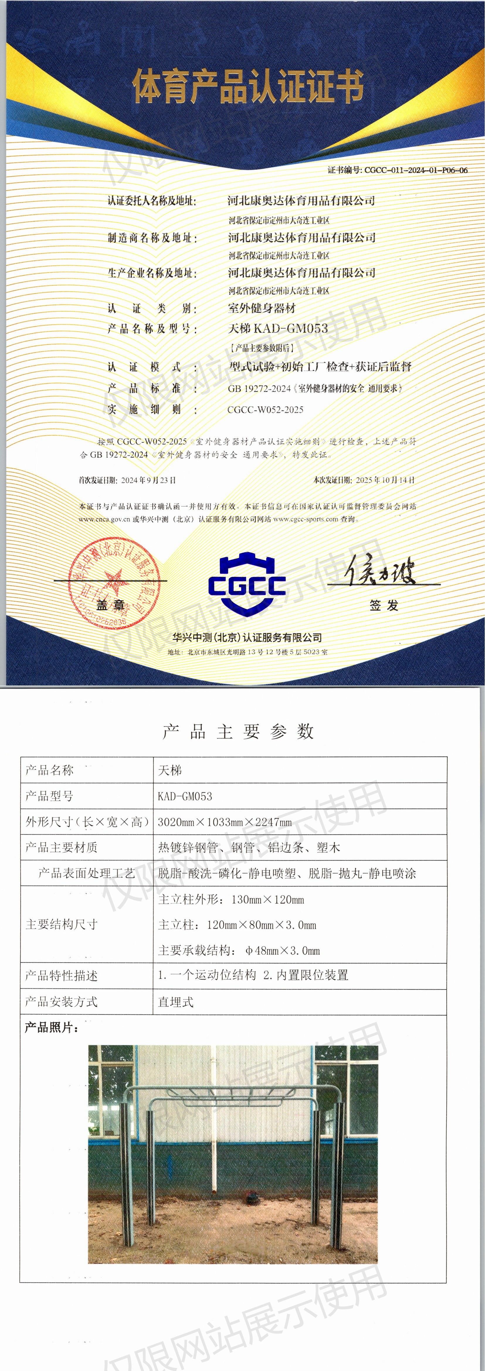 | 3 | 河北康奥达体育用品有限公司 | CGCC-011-2024-01-P06-06 | 天梯 | KAD-GM053 | 河北省保定市定州市大奇连工业区 | GB 19272-2024 | 2024-09-23 | 有效 | 查看 |