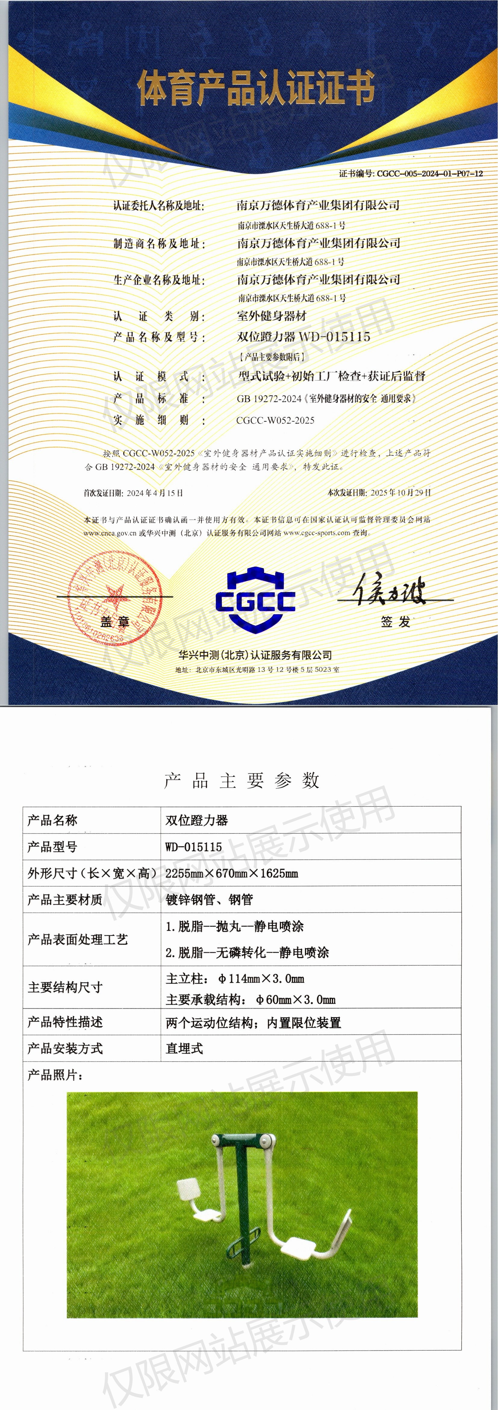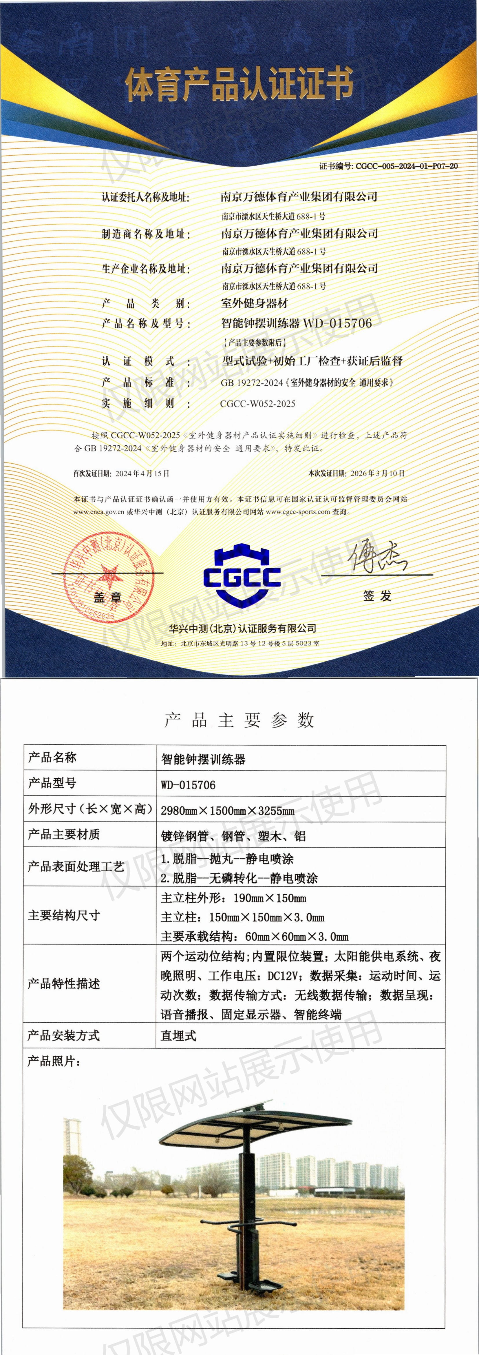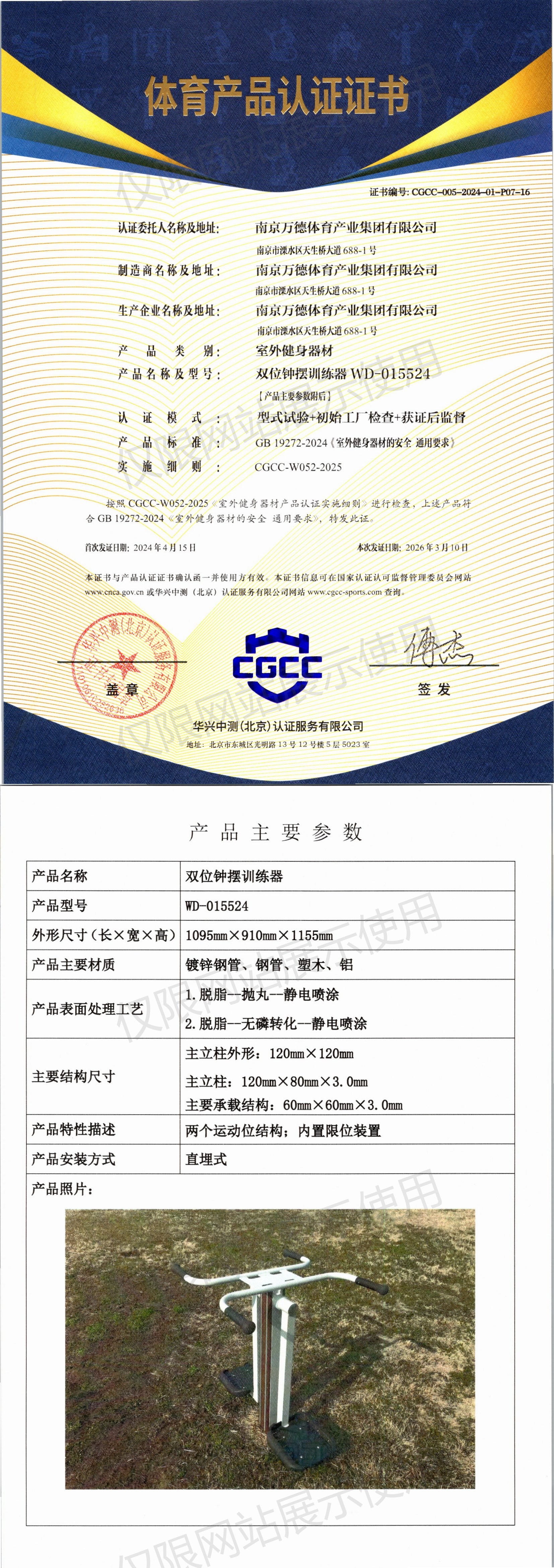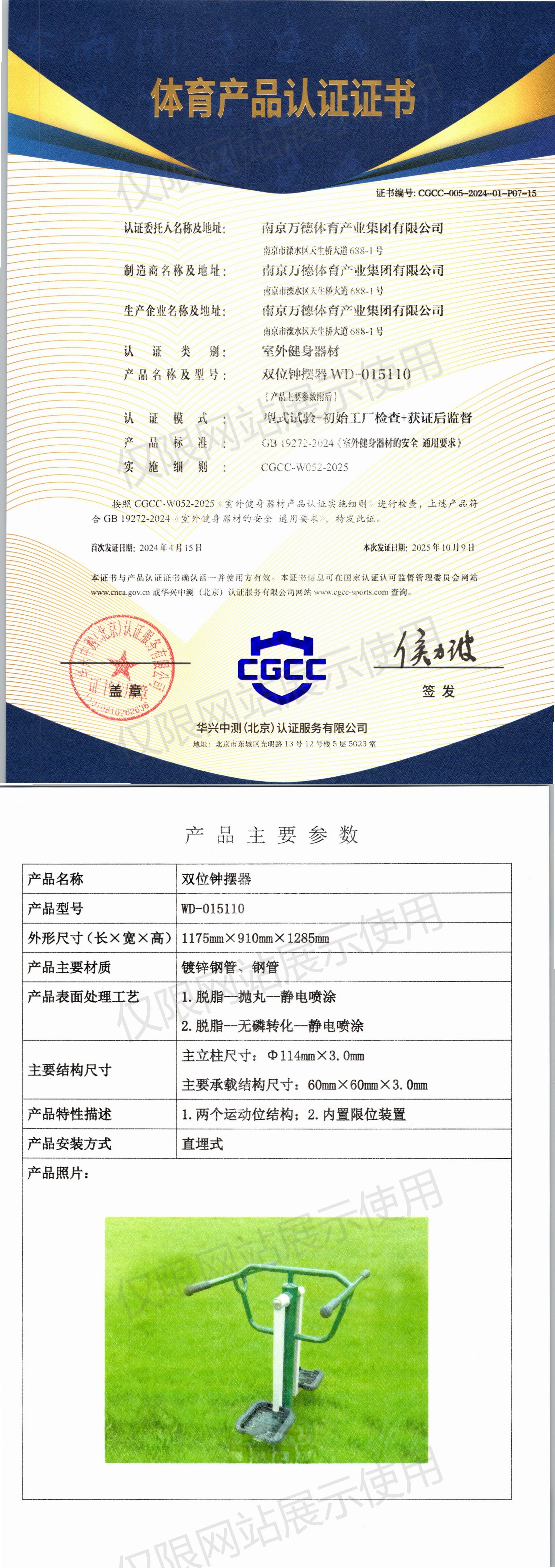 | 5 | 南京万德体育产业集团有限公司 | CGCC-005-2024-01-P07-15 | 双位钟摆器 | WD-015110 | 南京市溧水区天生桥大道688-1号 | GB 19272-2024 | 2024-04-15 | 有效 | 查看 |