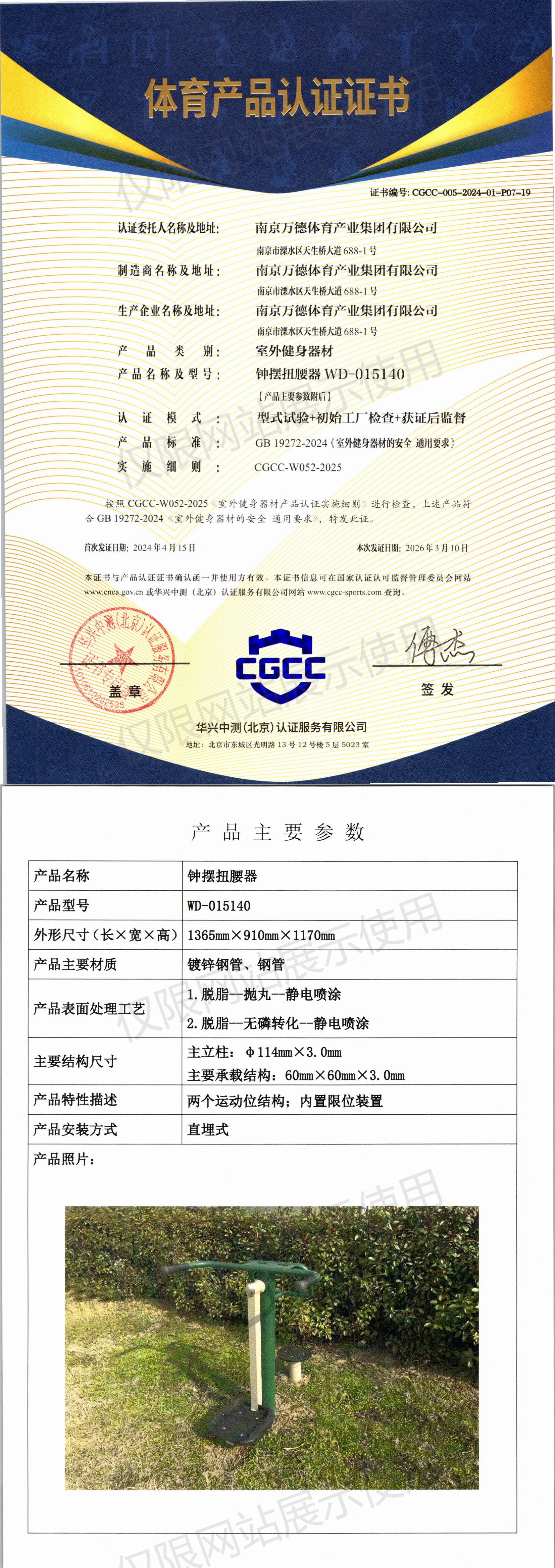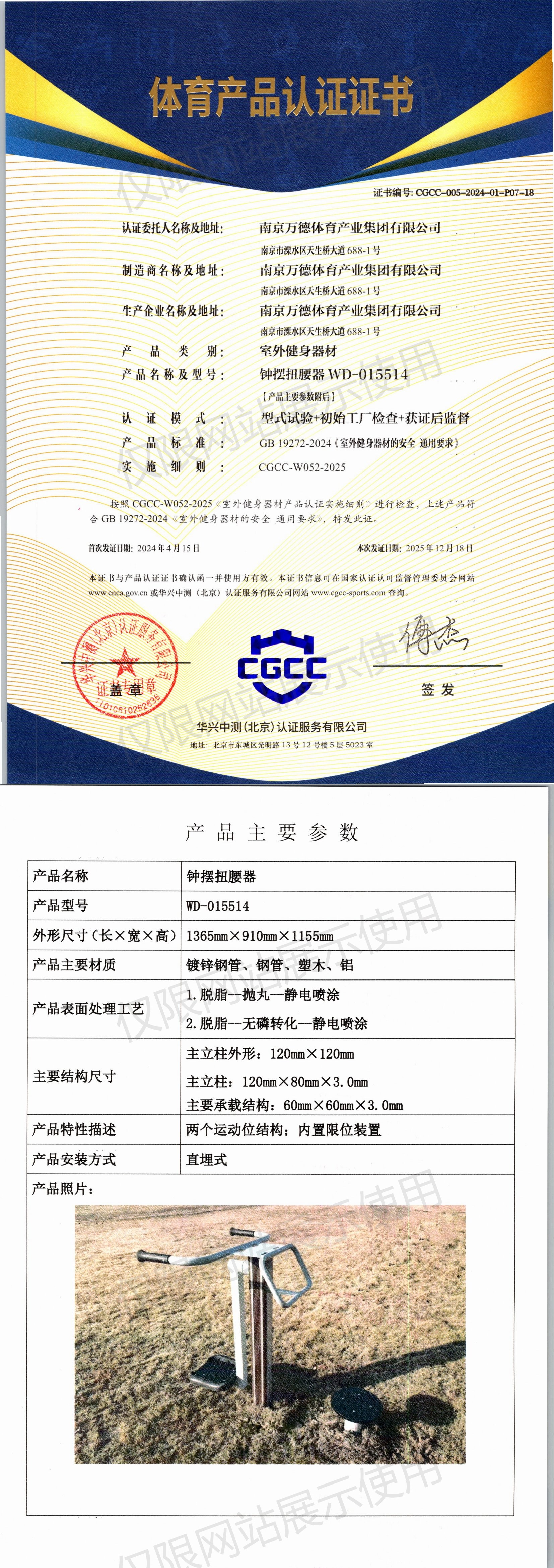 | 8 | 南京万德体育产业集团有限公司 | CGCC-005-2024-01-P07-18 | 钟摆扭腰器 | WD-015514 | 南京市溧水区天生桥大道688-1号 | GB 19272-2024 | 2024-04-15 | 有效 | 查看 |