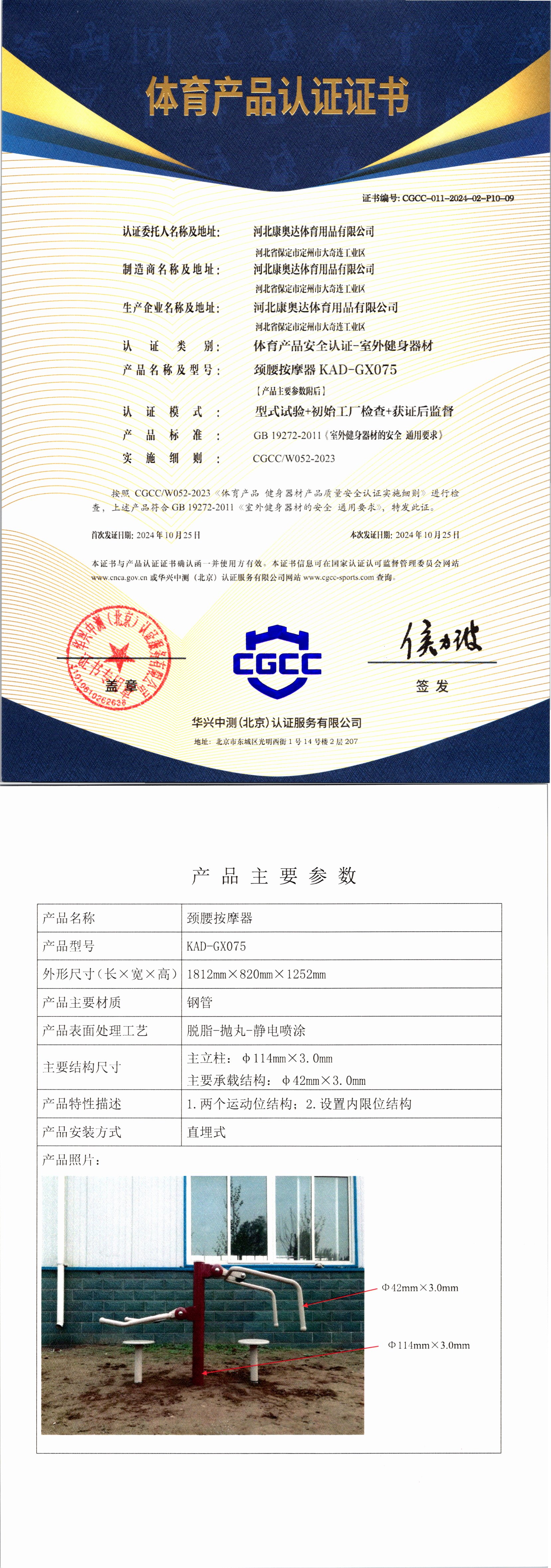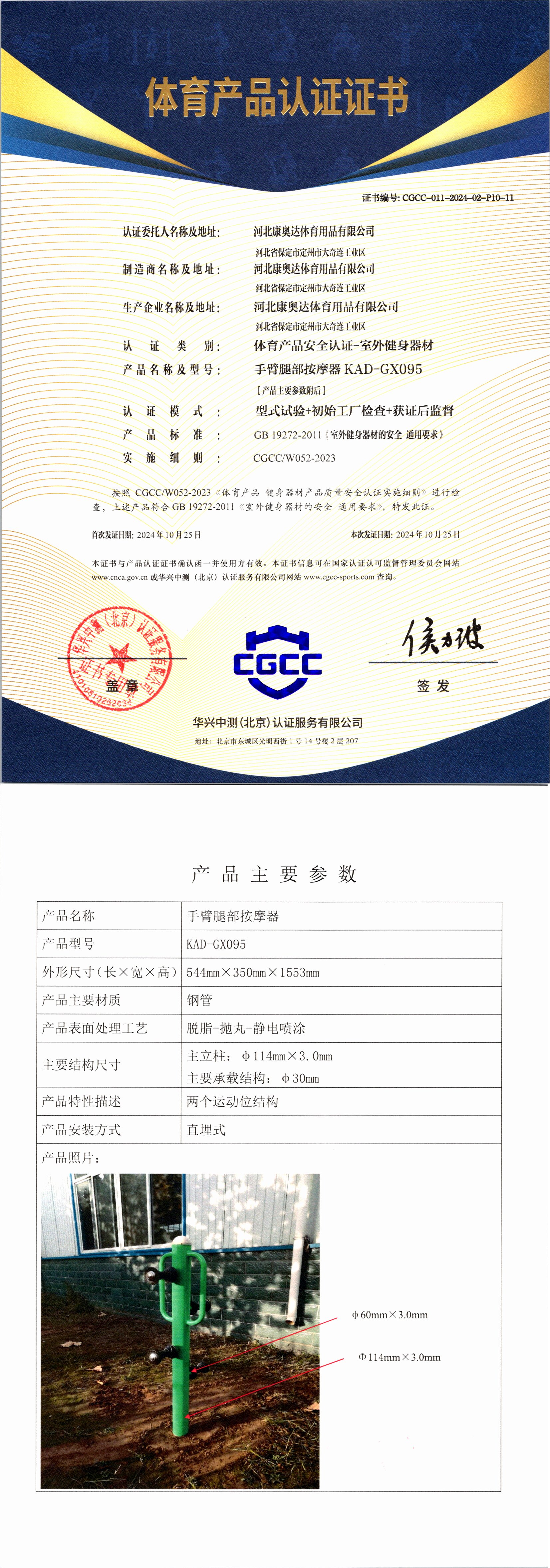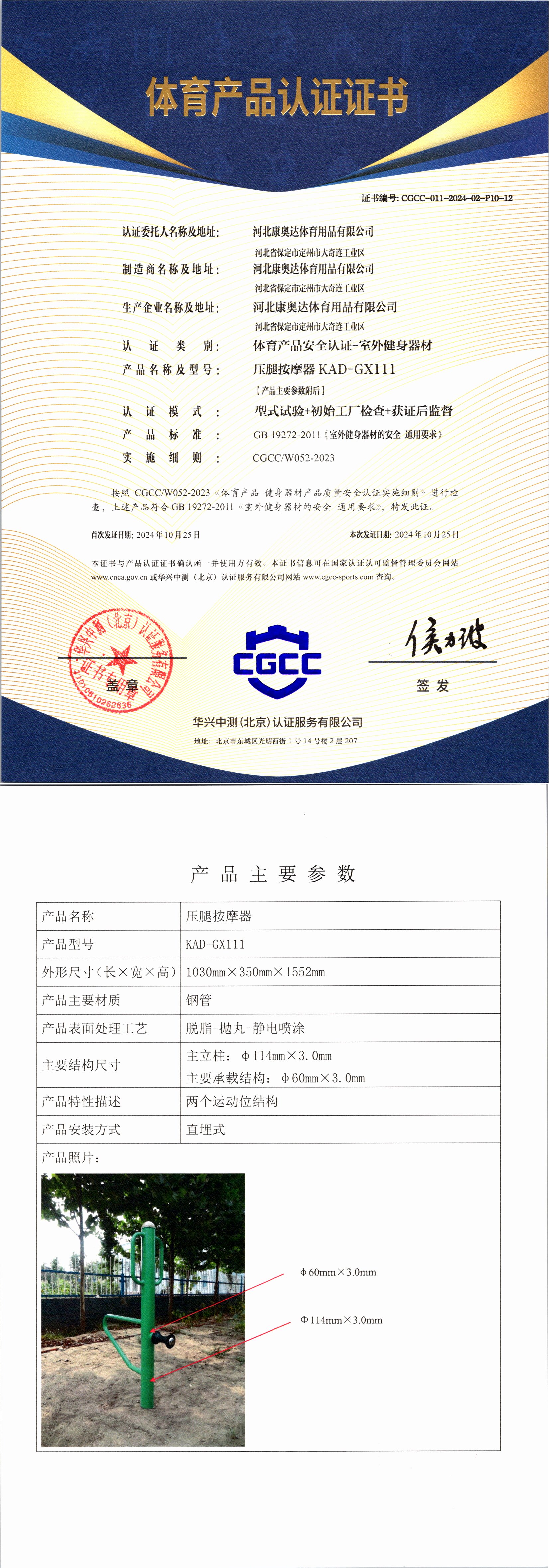 | 6 | 河北康奥达体育用品有限公司 | CGCC-011-2024-02-P10-12 | 压腿按摩器 | KAD-GX111 | 河北省保定市定州市大奇连工业区 | GB 19272-2011 | 2024-10-25 | 有效 | 查看 |