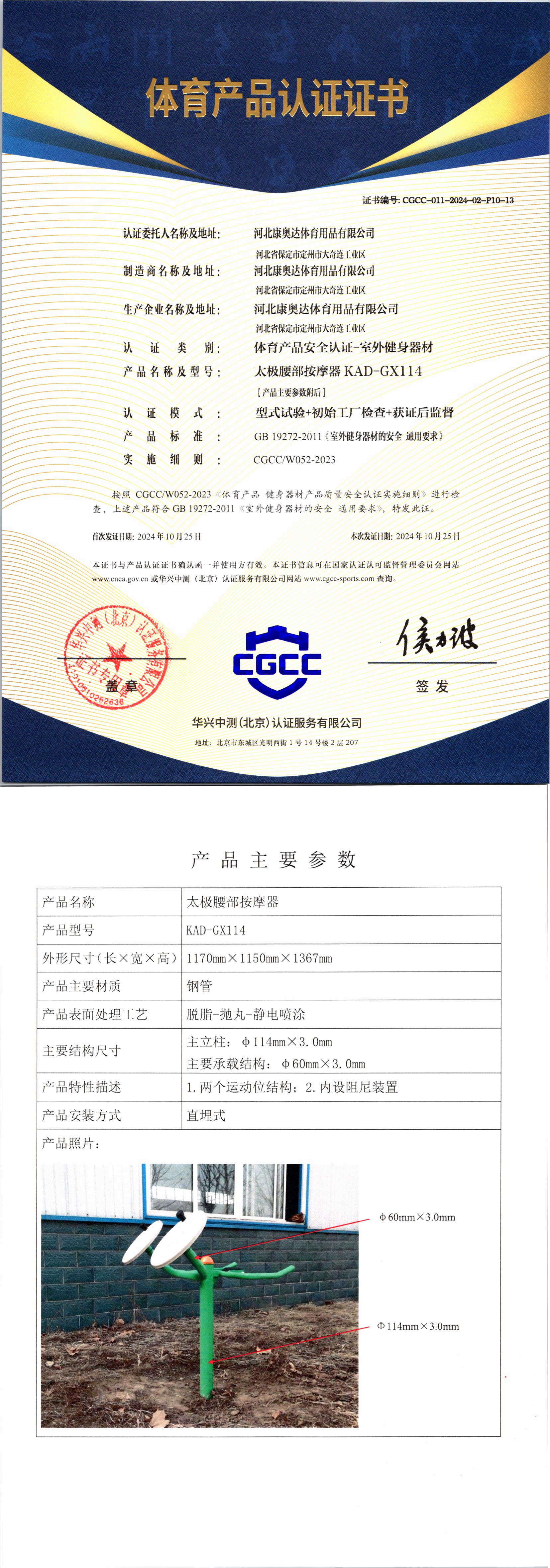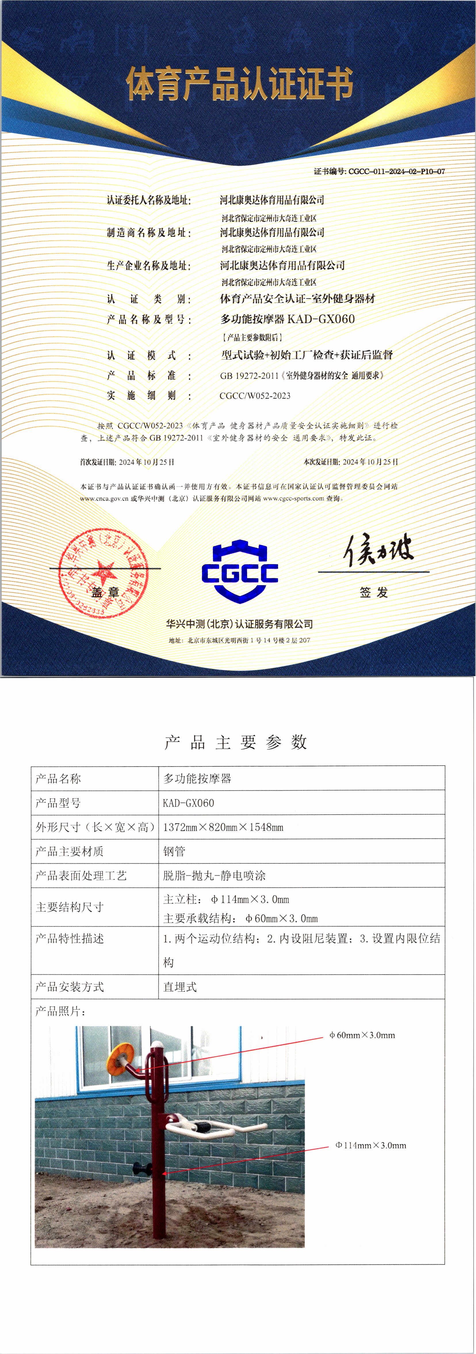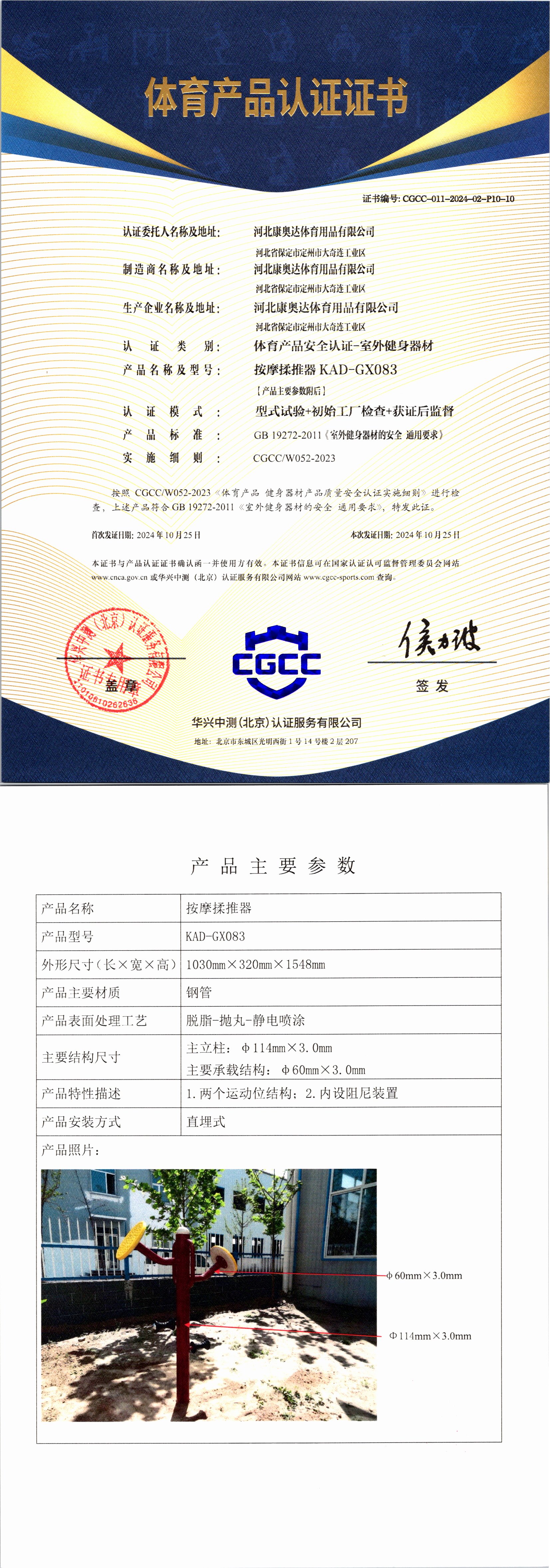 | 6 | 河北康奥达体育用品有限公司 | CGCC-011-2024-02-P10-12 | 压腿按摩器 | KAD-GX111 | 河北省保定市定州市大奇连工业区 | GB 19272-2011 | 2024-10-25 | 有效 | 查看 |