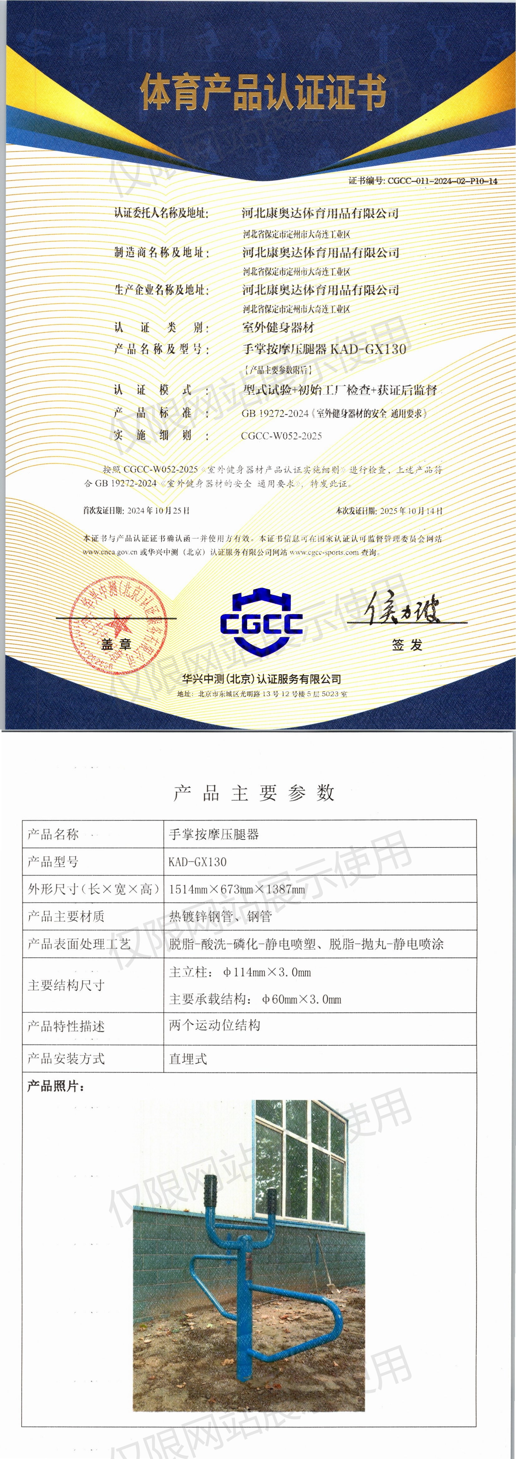 | 4 | 河北康奥达体育用品有限公司 | CGCC-011-2024-02-P10-14 | 手掌按摩压腿器 | KAD-GX130 | 河北省保定市定州市大奇连工业区 | GB 19272-2024 | 2024-10-25 | 有效 | 查看 |