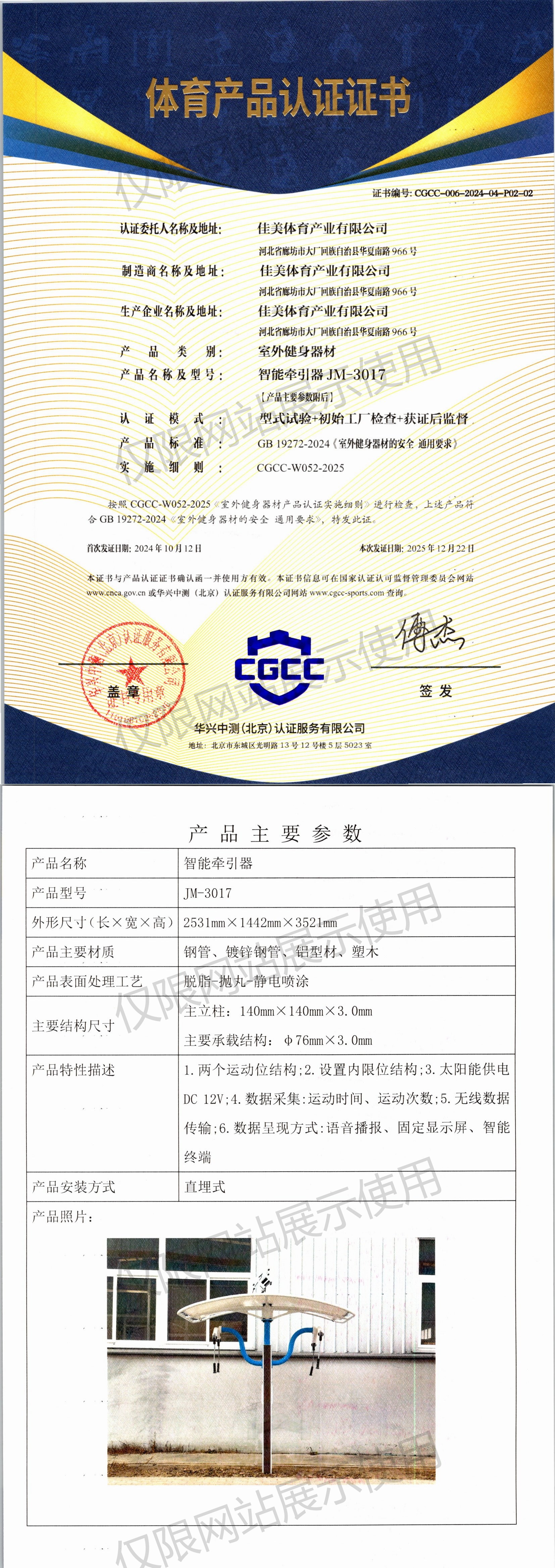 | 2 | 佳美体育产业有限公司 | CGCC-006-2024-04-P02-02 | 智能牵引器 | JM-3017 | 河北省廊坊市大厂回族自治县华夏南路966号 | GB 19272-2024 | 2024-10-12 | 有效 | 查看 |