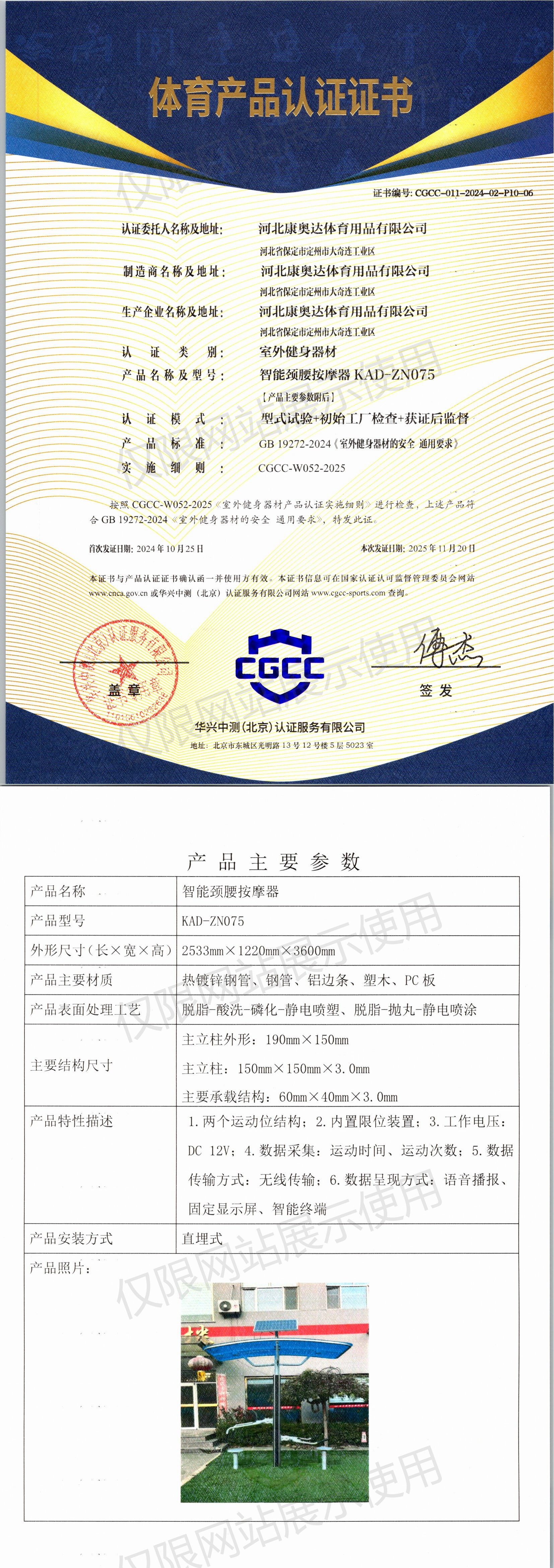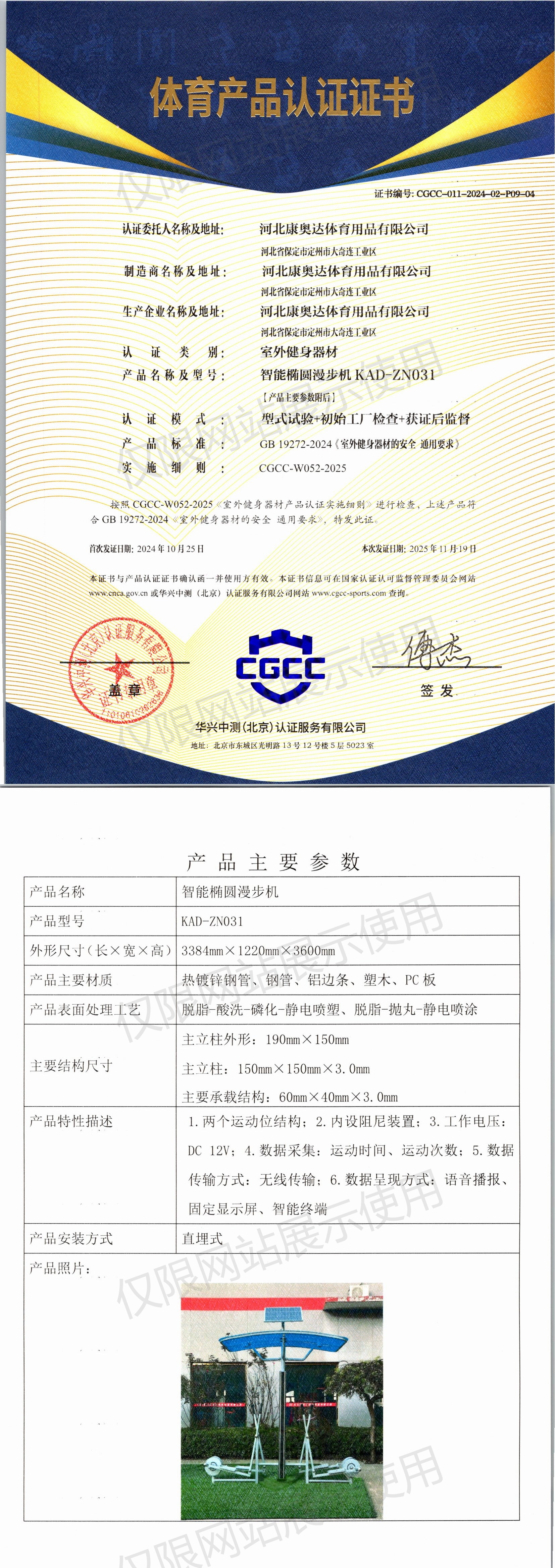 | 9 | 河北康奥达体育用品有限公司 | CGCC-011-2024-02-P09-04 | 智能椭圆漫步机 | KAD-ZN031 | 河北省保定市定州市大奇连工业区 | GB 19272-2024 | 2024-10-25 | 有效 | 查看 |