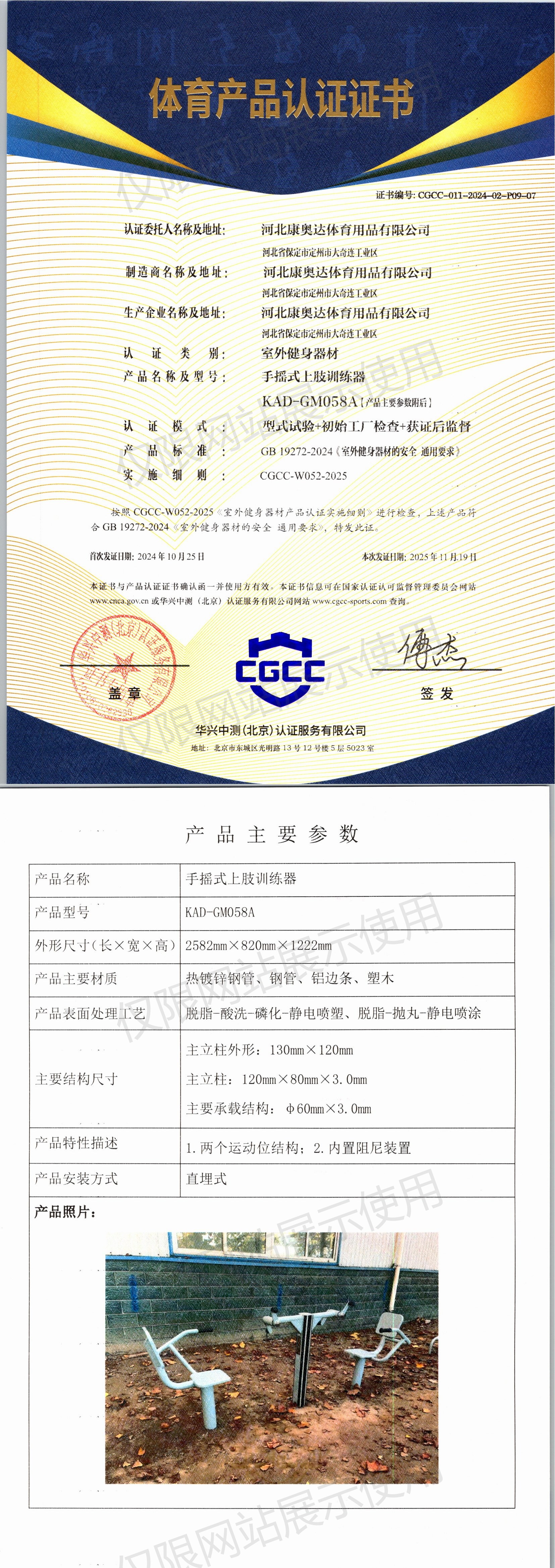 | 6 | 河北康奥达体育用品有限公司 | CGCC-011-2024-02-P09-07 | 手摇式上肢训练器 | KAD-GM058A | 河北省保定市定州市大奇连工业区 | GB 19272-2024 | 2024-10-25 | 有效 | 查看 |