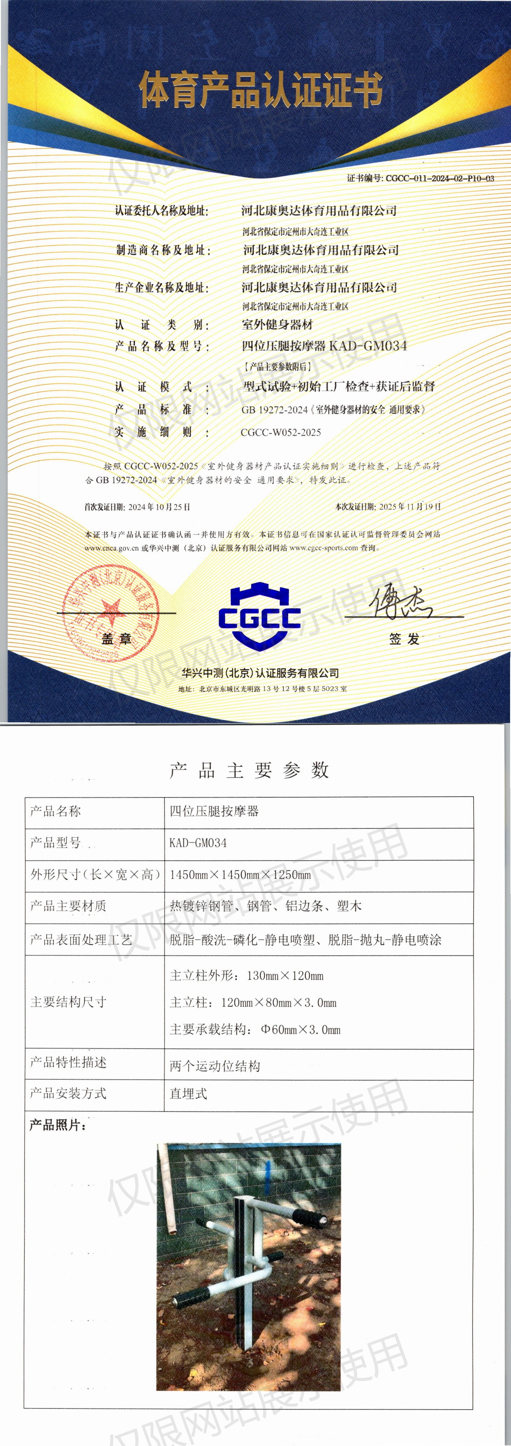 | 4 | 河北康奥达体育用品有限公司 | CGCC-011-2024-02-P10-03 | 四位压腿按摩器 | KAD-GM034 | 河北省保定市定州市大奇连工业区 | GB 19272-2024 | 2024-10-25 | 有效 | 查看 |